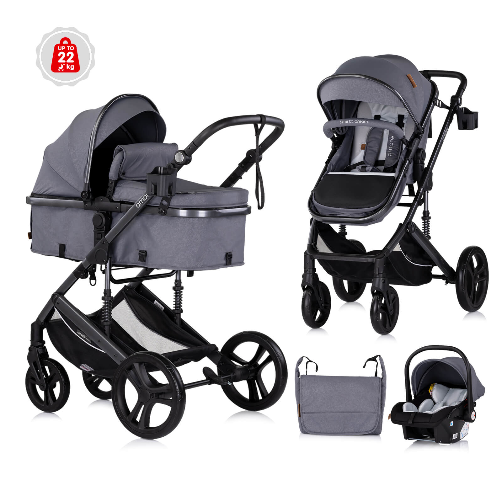 Съвместимо с рамата на количката, посредством адаптори, които са включени в комплекта;