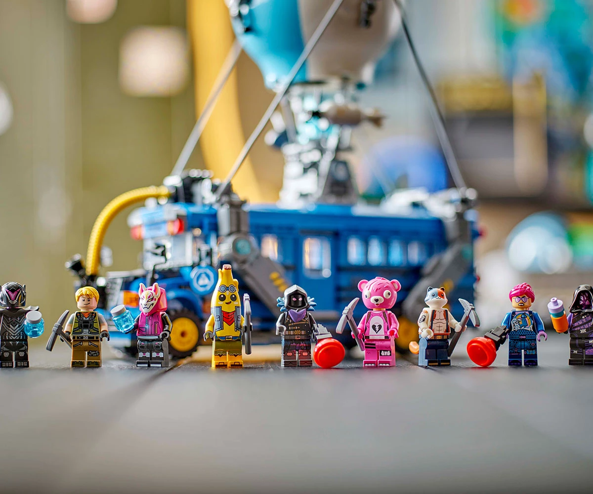 9 минифигури от LEGO® Fortnite® – Battalion Brawler, Adventure Peely, Brite Bomber, Cuddle Team Leader, Cube Assassin, Trespasser Elite, Drift, Meowscles и Raven вдъхват живот на приключението;