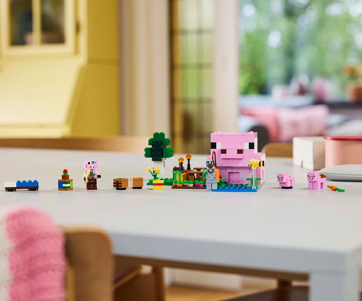 Къща на прасенце от LEGO® Minecraft® – децата построяват къща с форма на прасе, заедно с леха, където растат картофи и цвекло, поле с порта, през която да преведат прасенцето, и др.