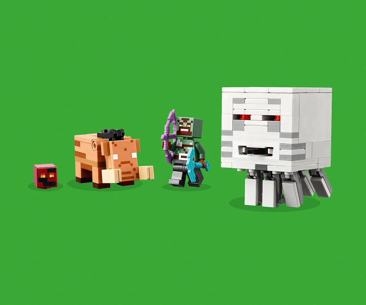 Бойни сцени и екшън фигури от Minecraft® – включва фигура на воин орк, призрак от Minecraft, който изстрелва дискове от устата си, фигура на хоглин с удряща глава и 2 куба от магма;