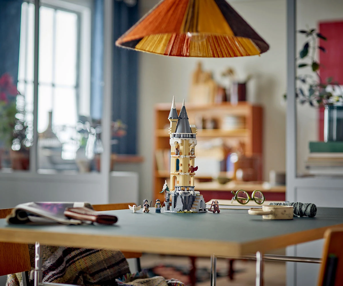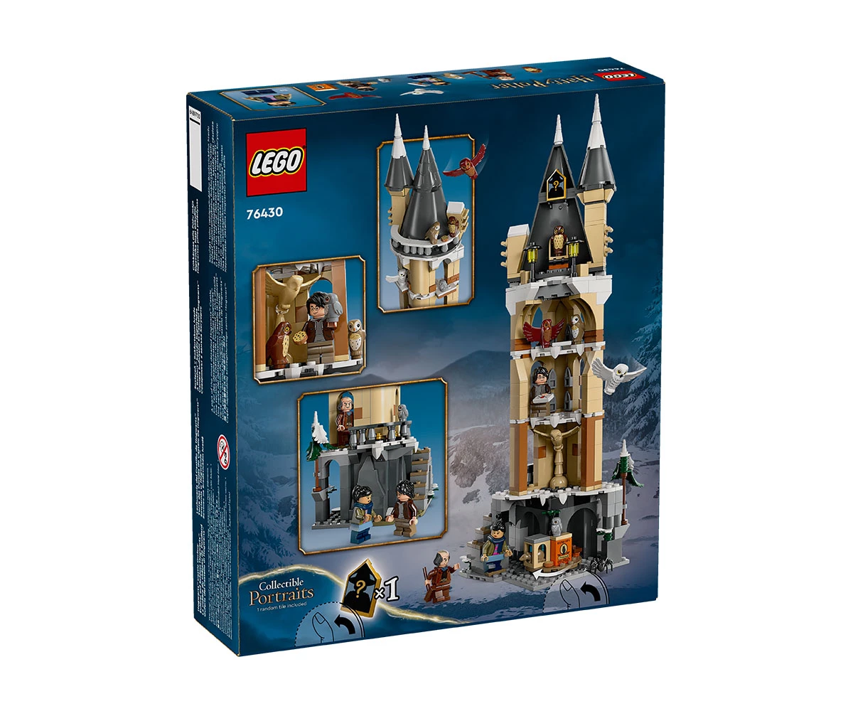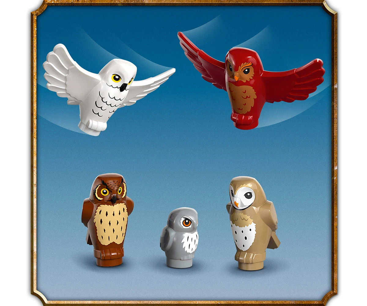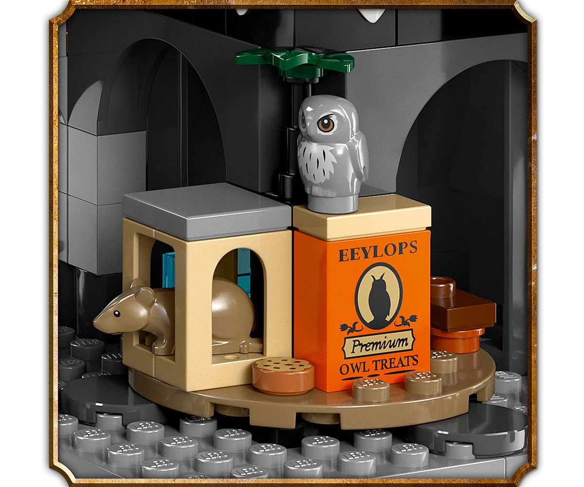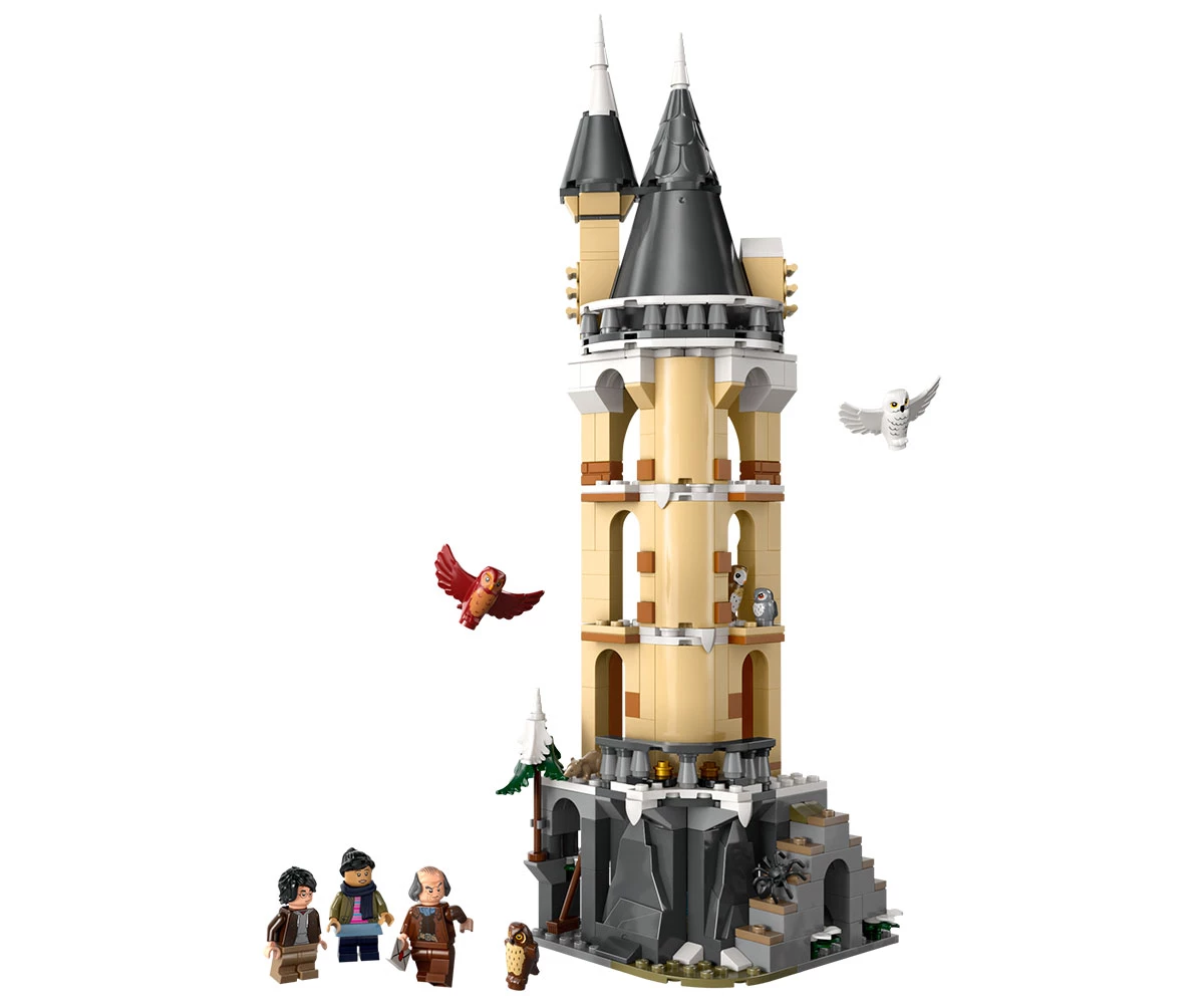 Детайлна играчка за построяване за деца – соварникът от тухлички, в който живеят совите на училището Хогуортс, е кула с первази на прозорците, на които совите могат да кацат, статуя на сова и аксесоари за грижа за совите;