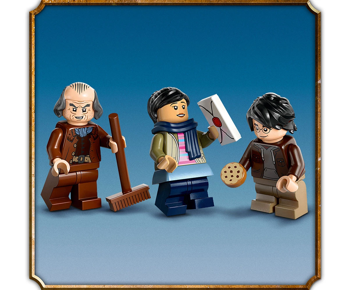 3-ма герои от LEGO® Harry Potter™ – минифигури от LEGO на Чо Чан, Аргус Филч и Хари Потър, плюс 5 различни фигури на сови, включително Пигуиджън;