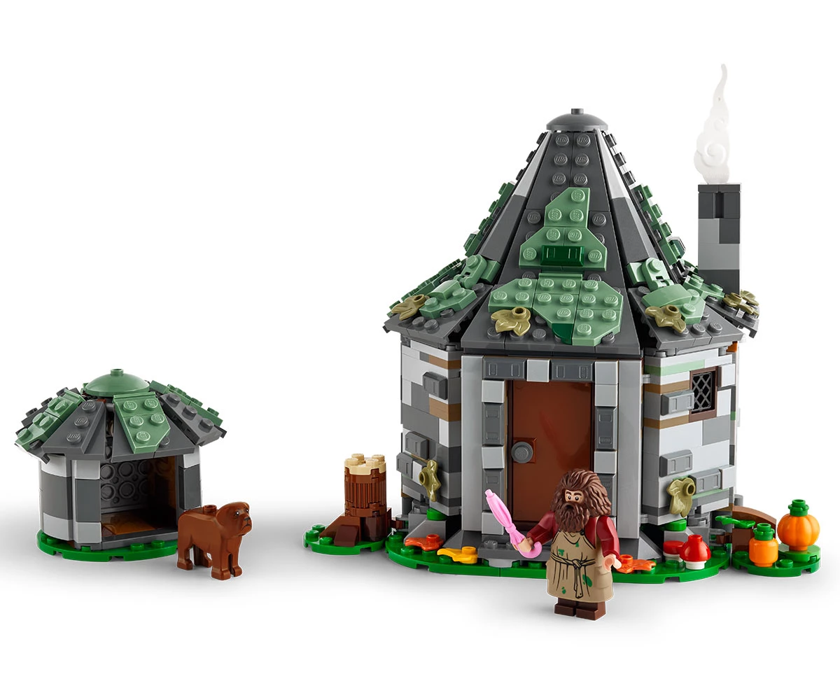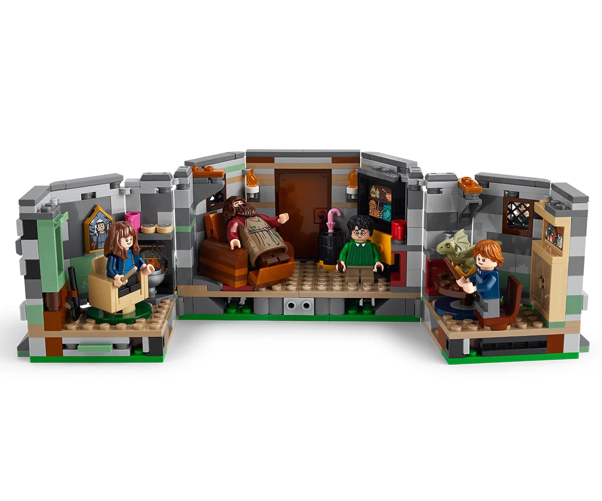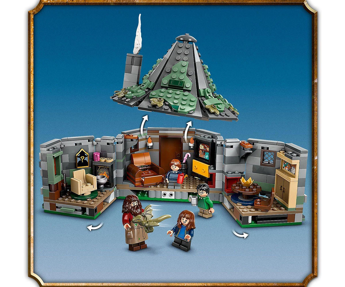Колиба и кучешка колиба за конструиране – колибата има подвижен покрив и се отваря за лесна игра, а детайлният интериор включва сгъваемия стол на Хагрид, стойка за чадър и драконово яйце;