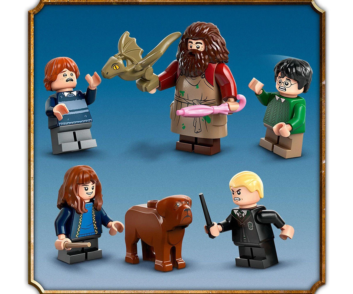 7 герои от LEGO® Harry Potter™ – минифигури на Хари Потър, Хърмаяни Грейнджър, Рон Уизли, Драко Малфой и Рубиъс Хагрид, плюс фигури от LEGO на дракона Норбърт и кучето Фанг на Хагрид;