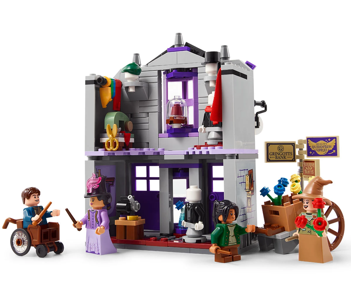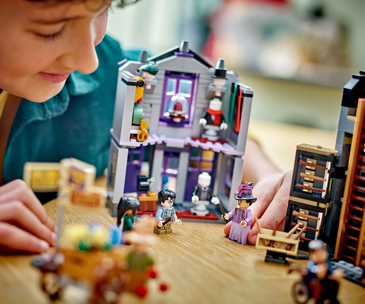 2 магазина на Диагон-али – Забавна идея за подарък за феновете на Хари Потър, тази играчка за построяване разполага с модели от тухлички LEGO® с автентични детайли на магазините на Оливандър и Мадам Молкин за магически игри;