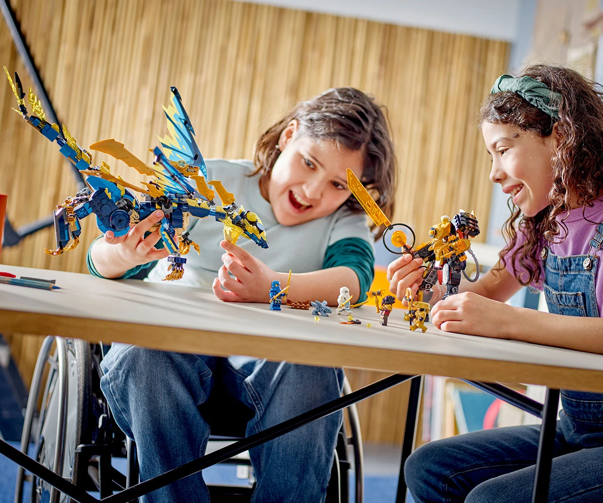 Комплект за игра с дракон и робот – децата на възраст 9+ могат да разиграват епичен сблъсък от телевизионния сериал NINJAGO® Dragons Rising с комплекта „Стихиен дракон срещу робот на Императрицата (71796)“;