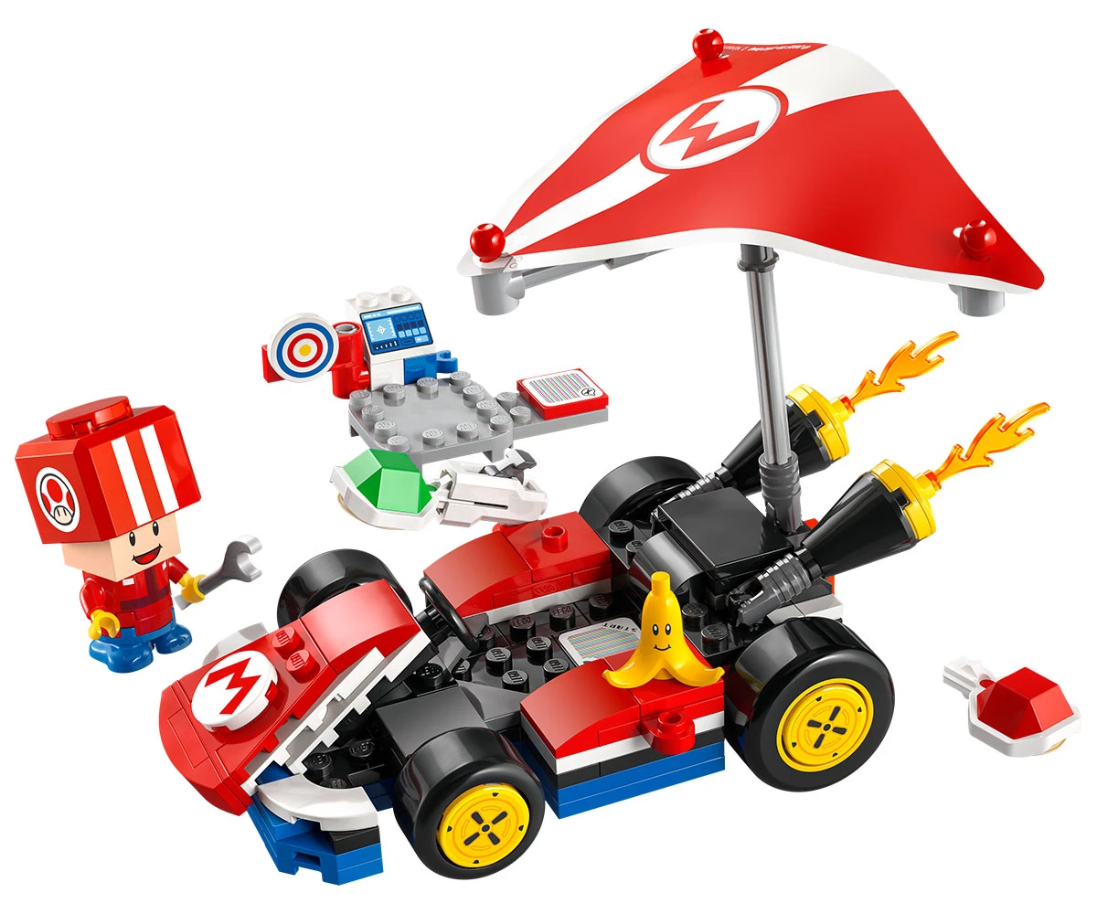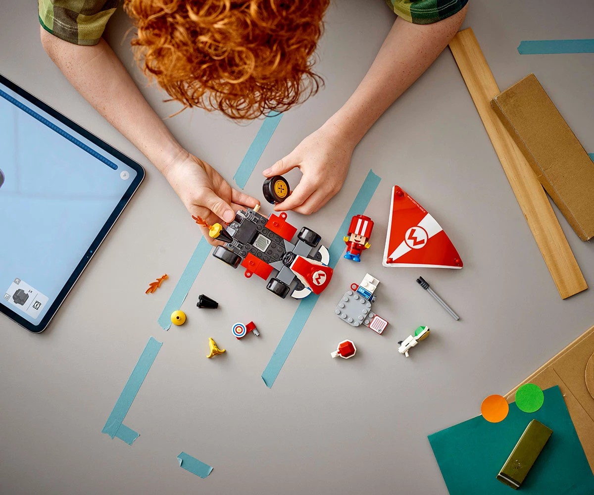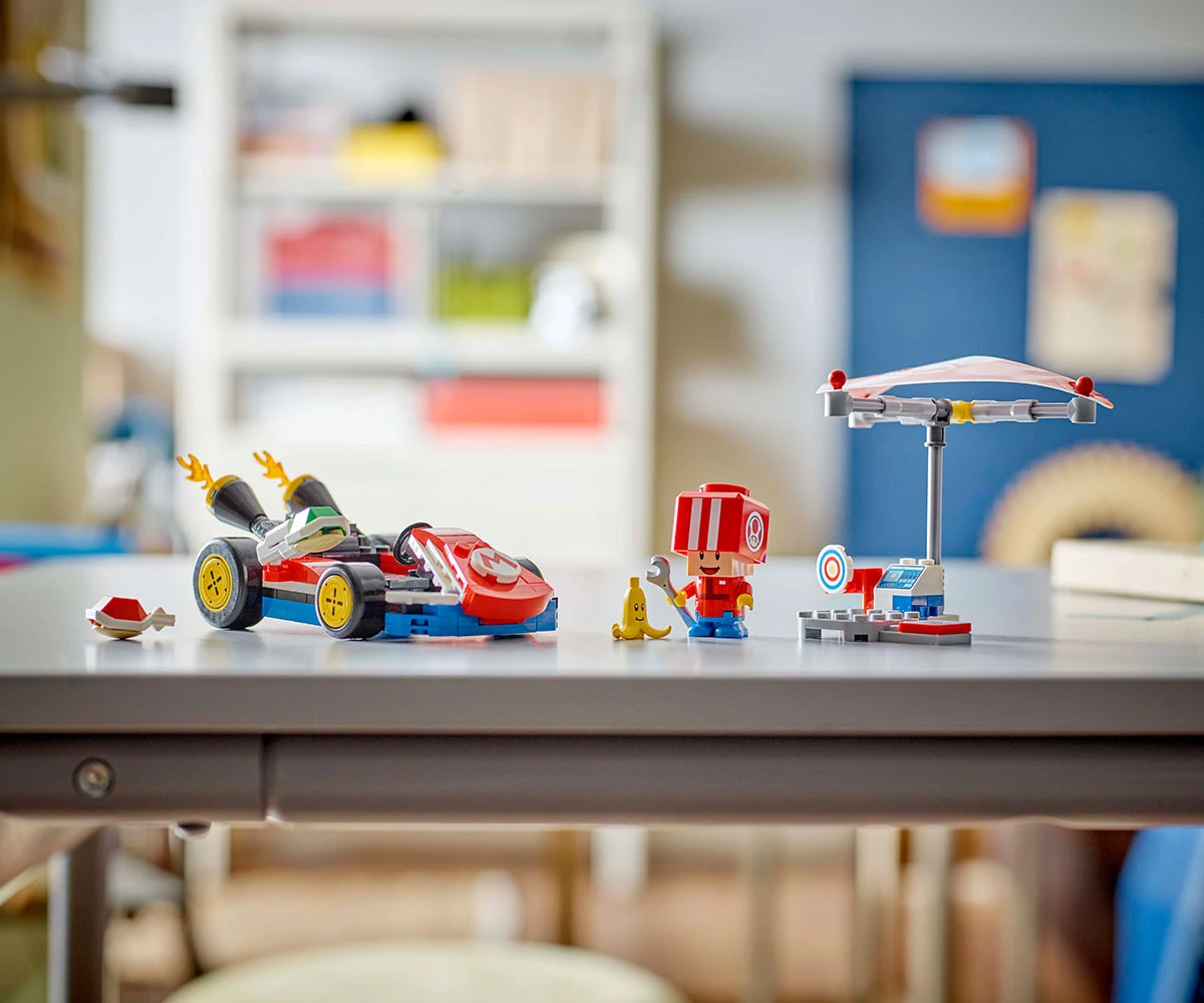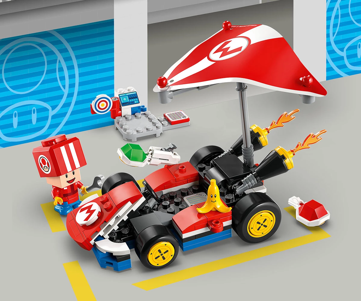 • Комплект за игра с кола LEGO® Super Mario™ – присъединете се към Toad (Pit Crew) за състезания, дрифт и плъзгане с модел от тухлички на Standard Kart от Mario Kart™, плюс работна станция;