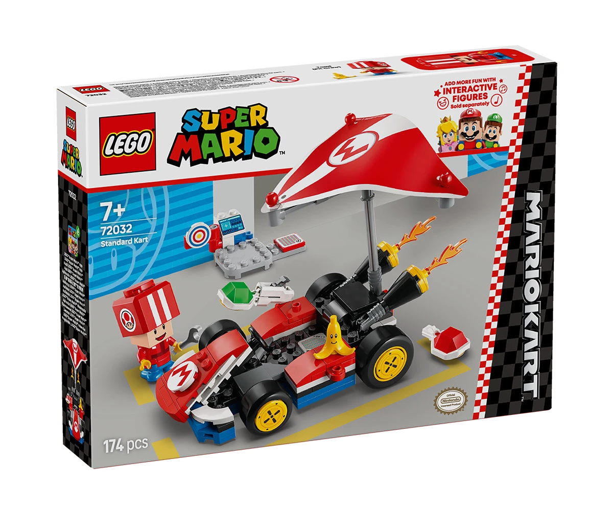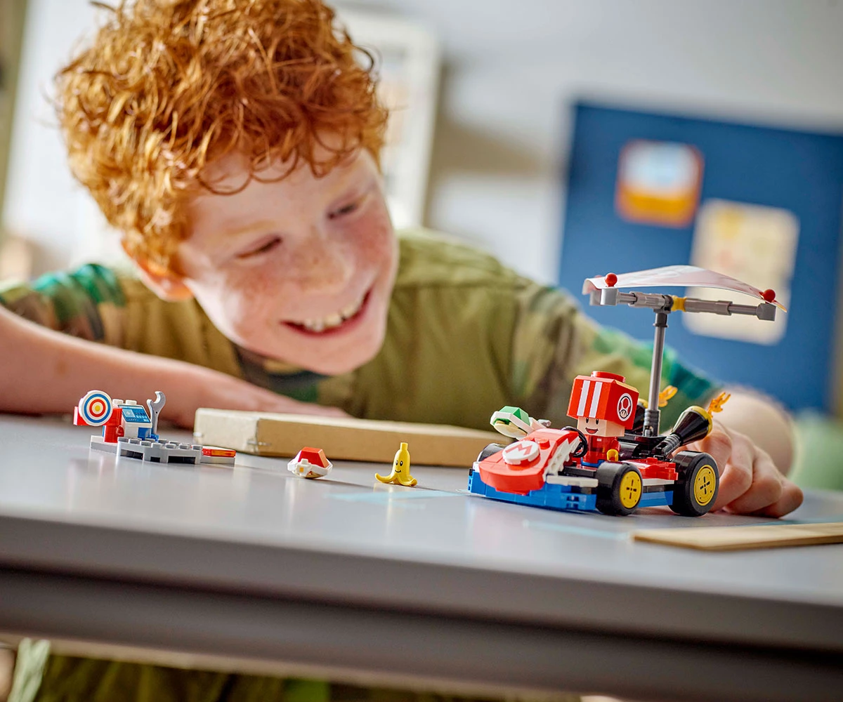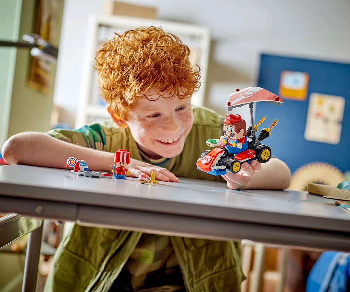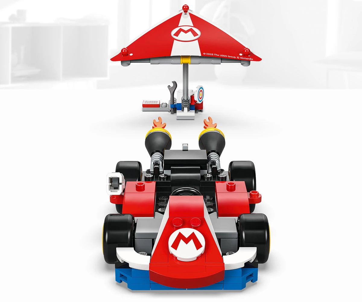 • Комплект за игра с кола LEGO® Super Mario™ – присъединете се към Toad (Pit Crew) за състезания, дрифт и плъзгане с модел от тухлички на Standard Kart от Mario Kart™, плюс работна станция;