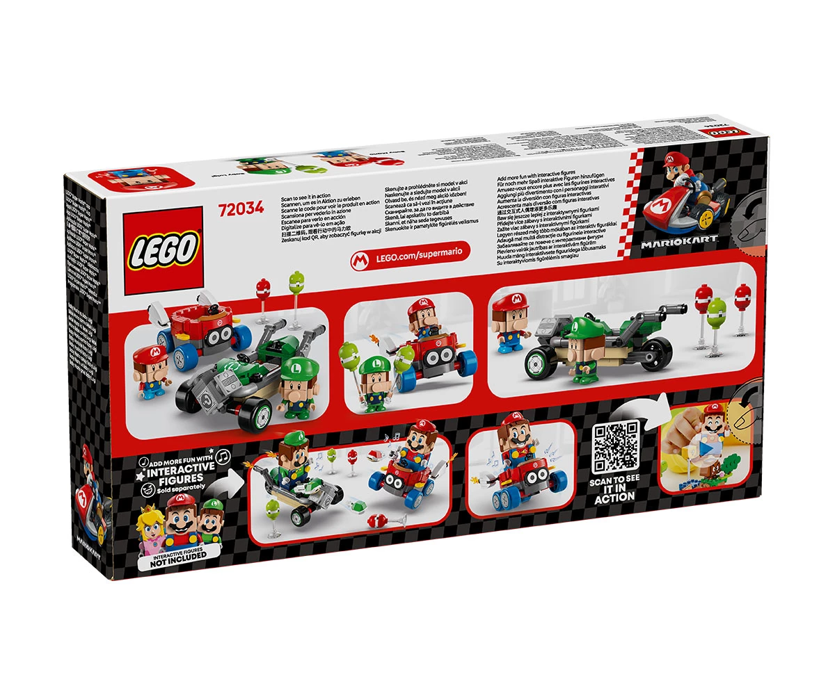 Комплект от тухлички Mario Kart™ – обединете сили с Baby Mario или Baby Luigi за битки с балони и състезателен екшън с този приключенски комплект за игра LEGO® Super Mario™;