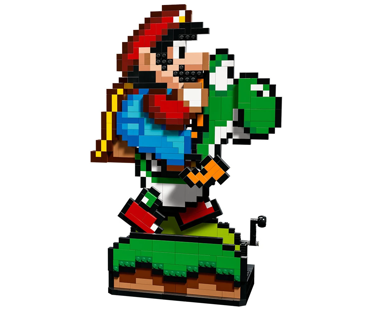 Пикселизирани фигури Nintendo® – завъртете дръжката в основата на модела, за да накарате Yoshi да тича с Mario на гърба си, и врътнете диска зад главата на Yoshi, за да накарате езика му да изскача навън;