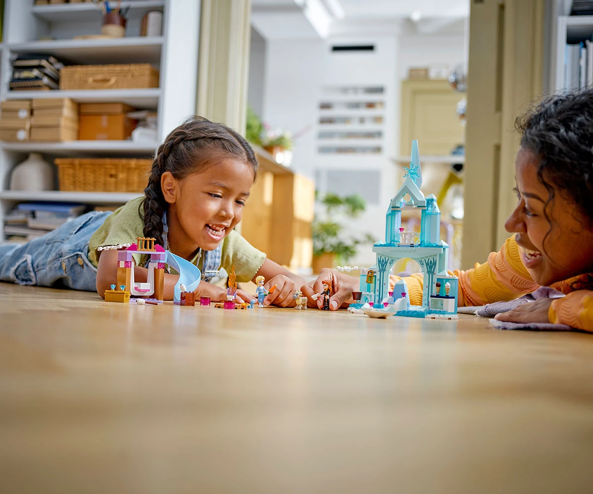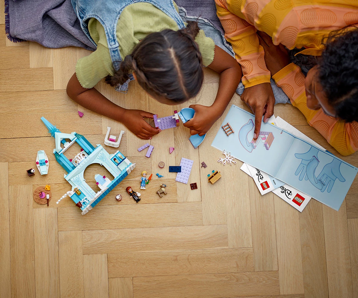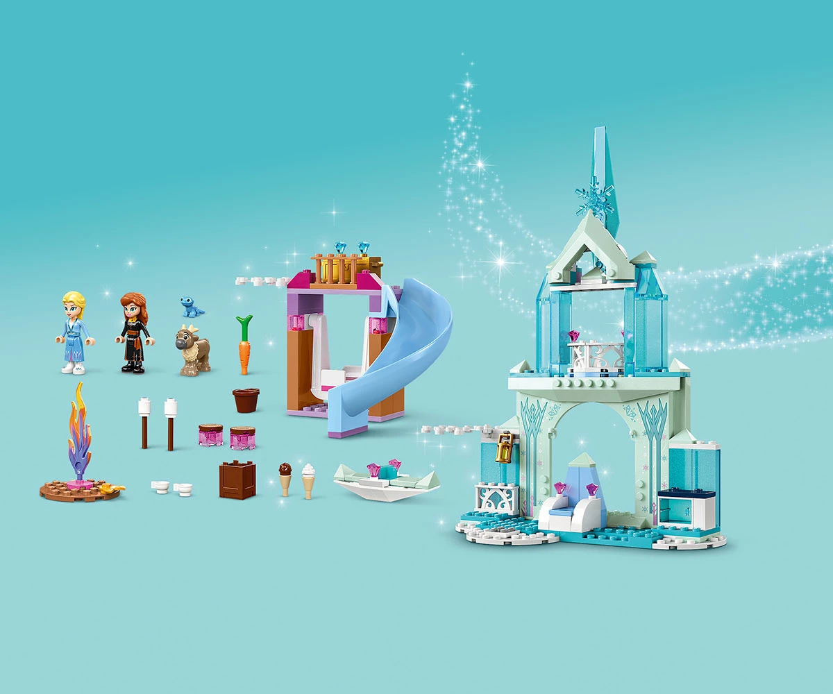 Комплект за конструиране и игра със замък – комплектът за конструиране Disney Frozen има замък, вдъхновен от Замръзналото кралство, фигури миникукла на Елза и Анна от LEGO® ǀ Disney и 2 фигури на животните Бруни и бебе еленче от LEGO ǀ Disney;