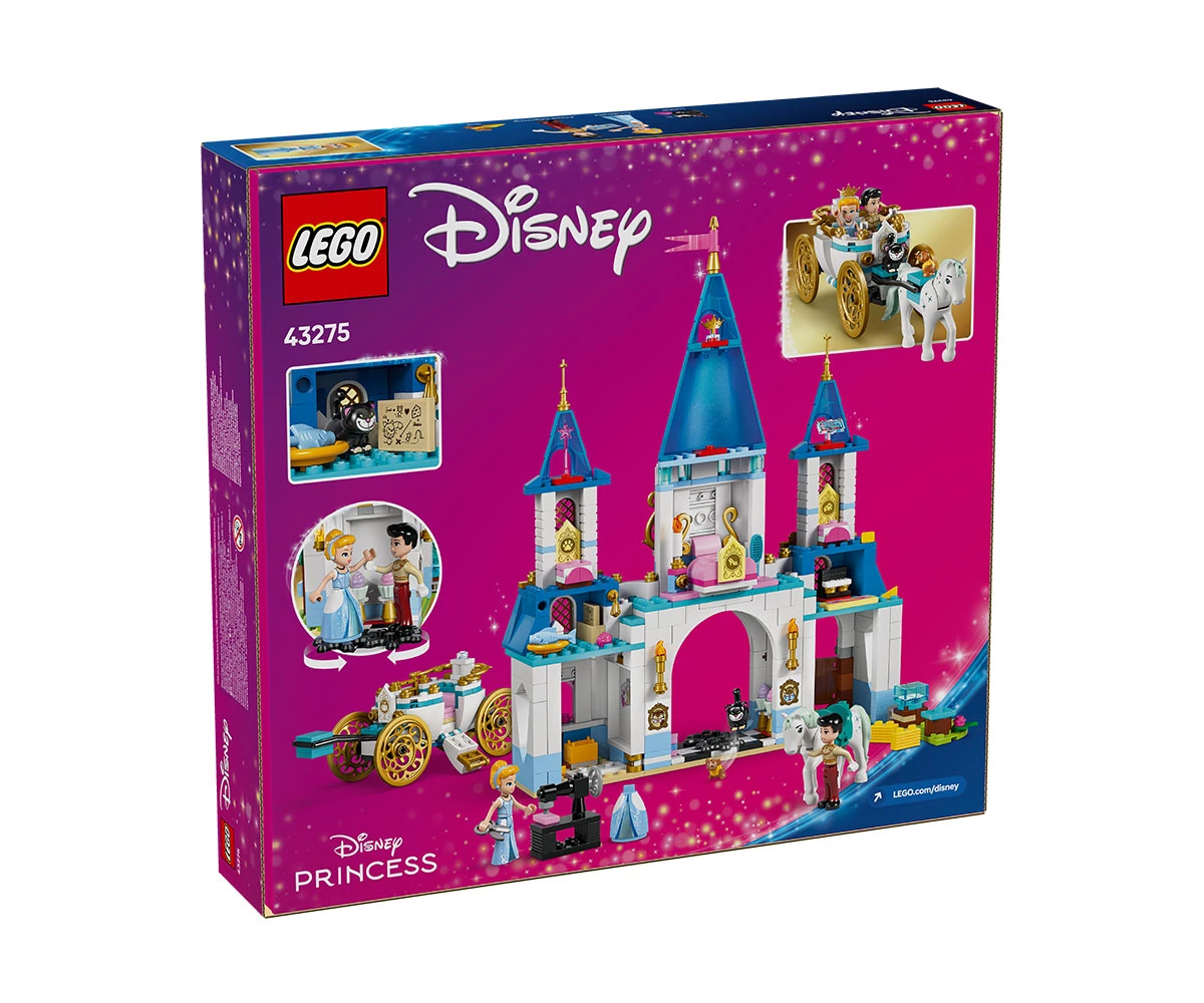 Комплект за игра с дворец на Disney – фантастичната строителна играчка има 4 входа, включително врата замишки, прозорец за Луцифер, роклята на Пепеляшка, корона и пръчка, карета със сбруя и златни акценти и други;