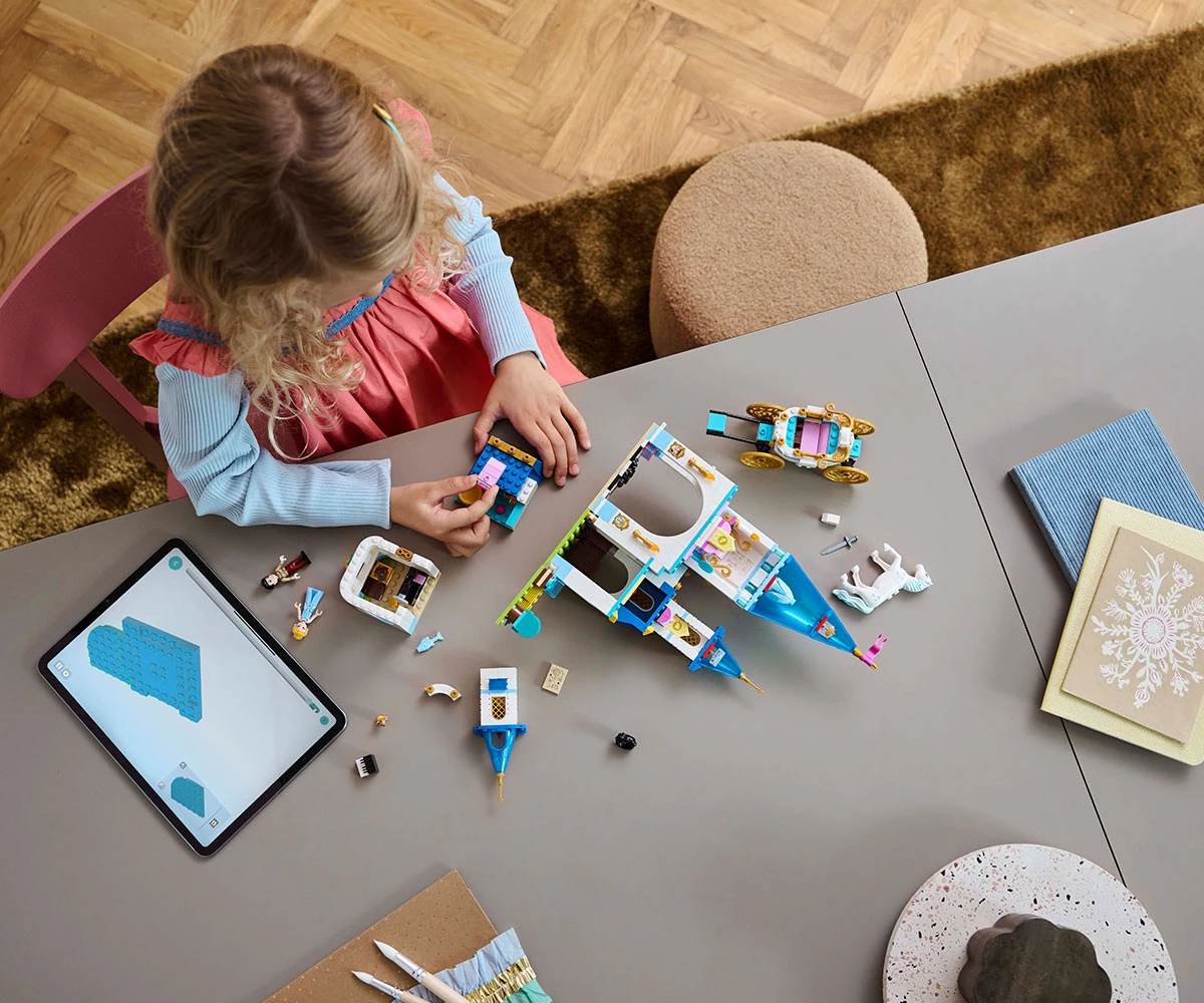 Комплект с модел – включва дворец за построяване на 2 нива с конюшня, множество стаи, въртящ се под, карета със сбруя и фигура на кон LEGO® ǀ Disney, четирима герои на LEGO ǀ Disney и други;