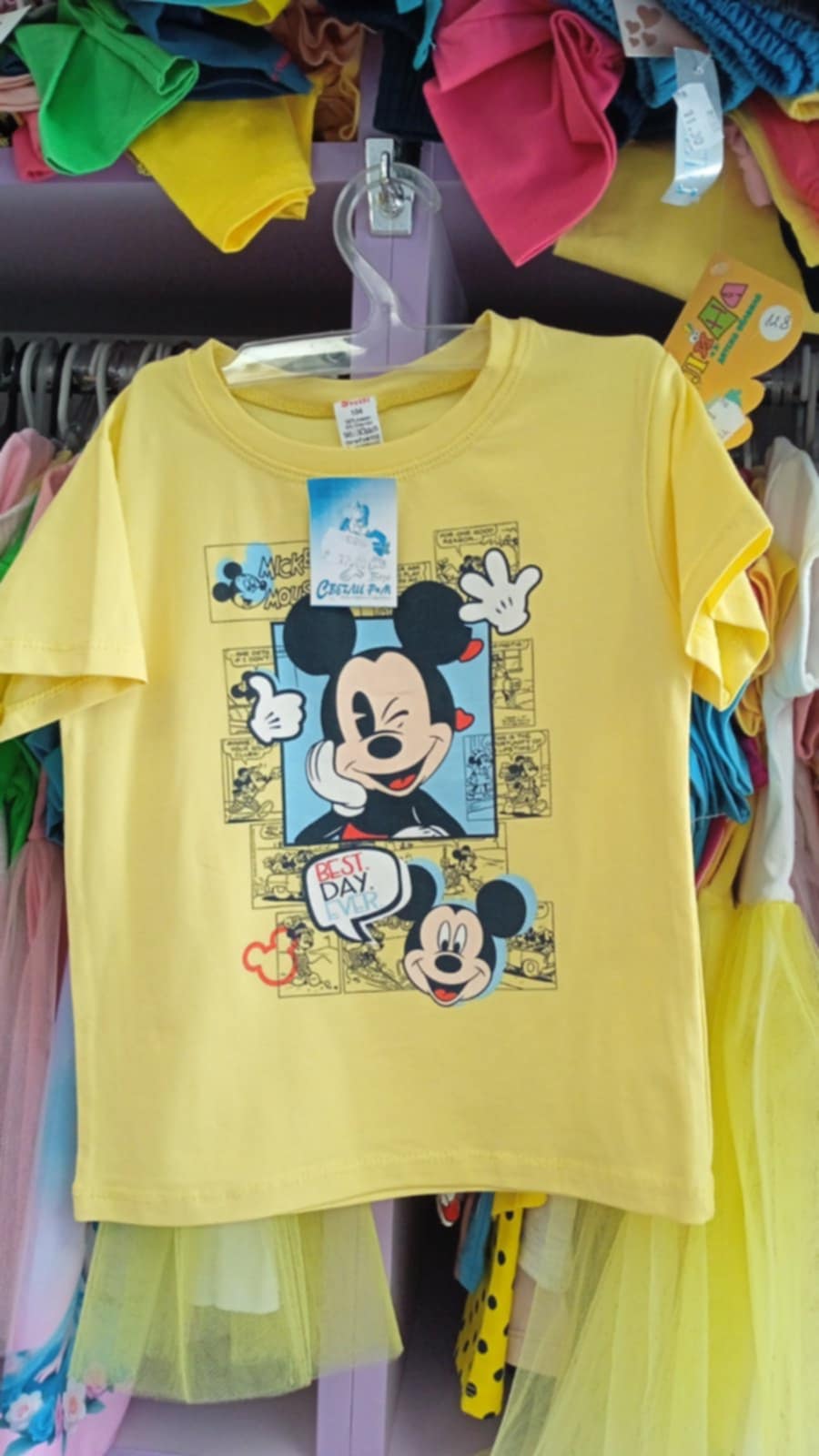 Тениската е с къс ръкав в жълт цвят с цветна апликация на Мики Маус;