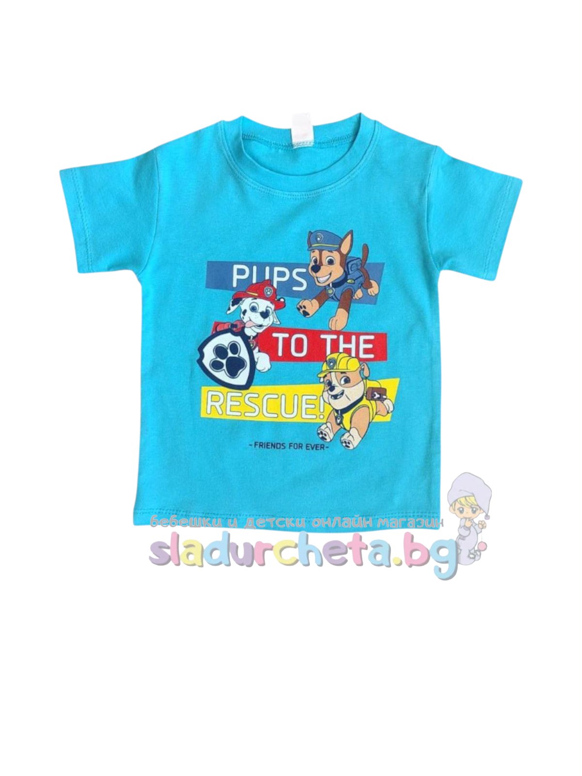 Тениската е с къс ръкав в син цвят с цветна апликация на Пес Патрул;