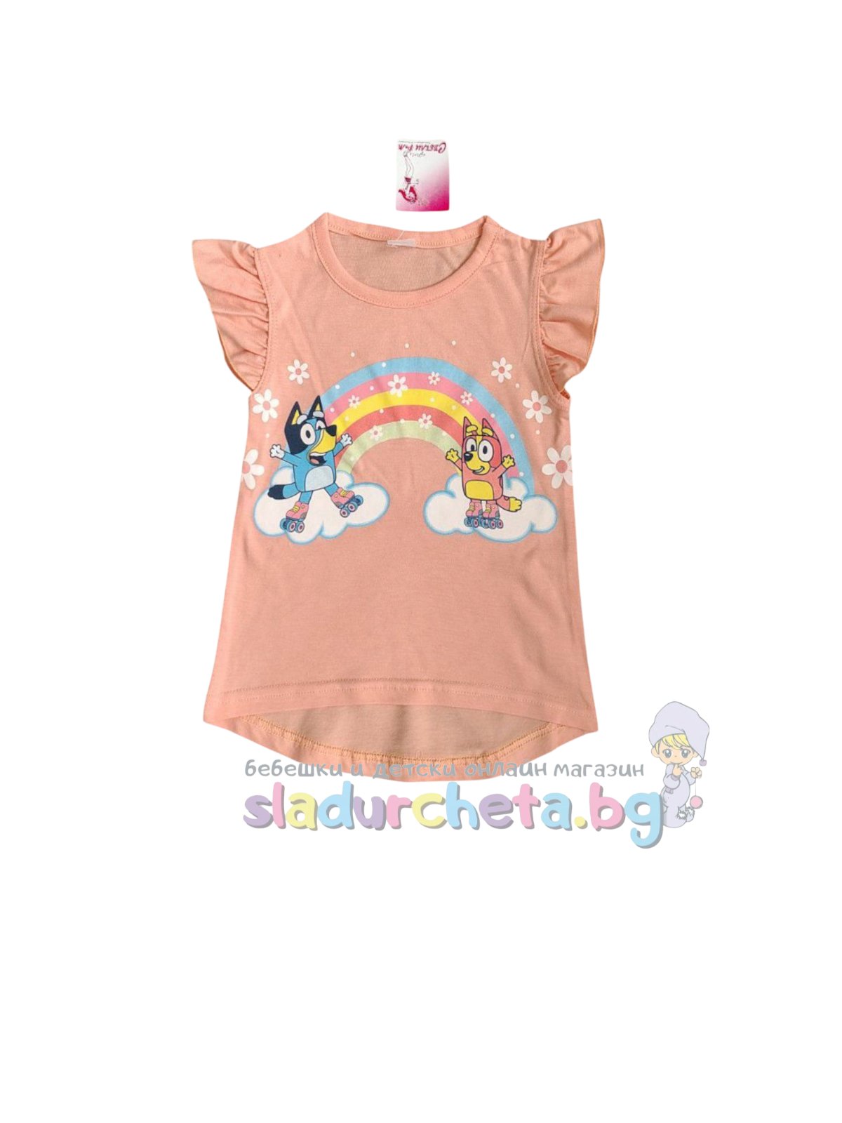 Тениската е с къси къдрави ръкави в прасковен цвят с цветна апликация на Блуи;