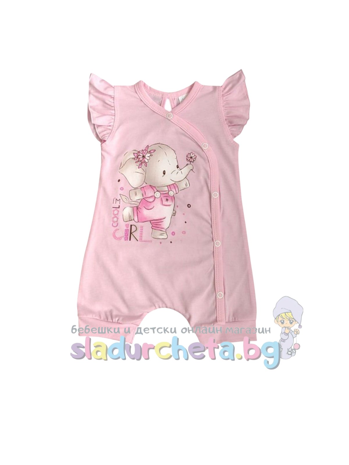 Гащеризонът е с къс ръкав в розов цвят с цветна апликация на слонче;
