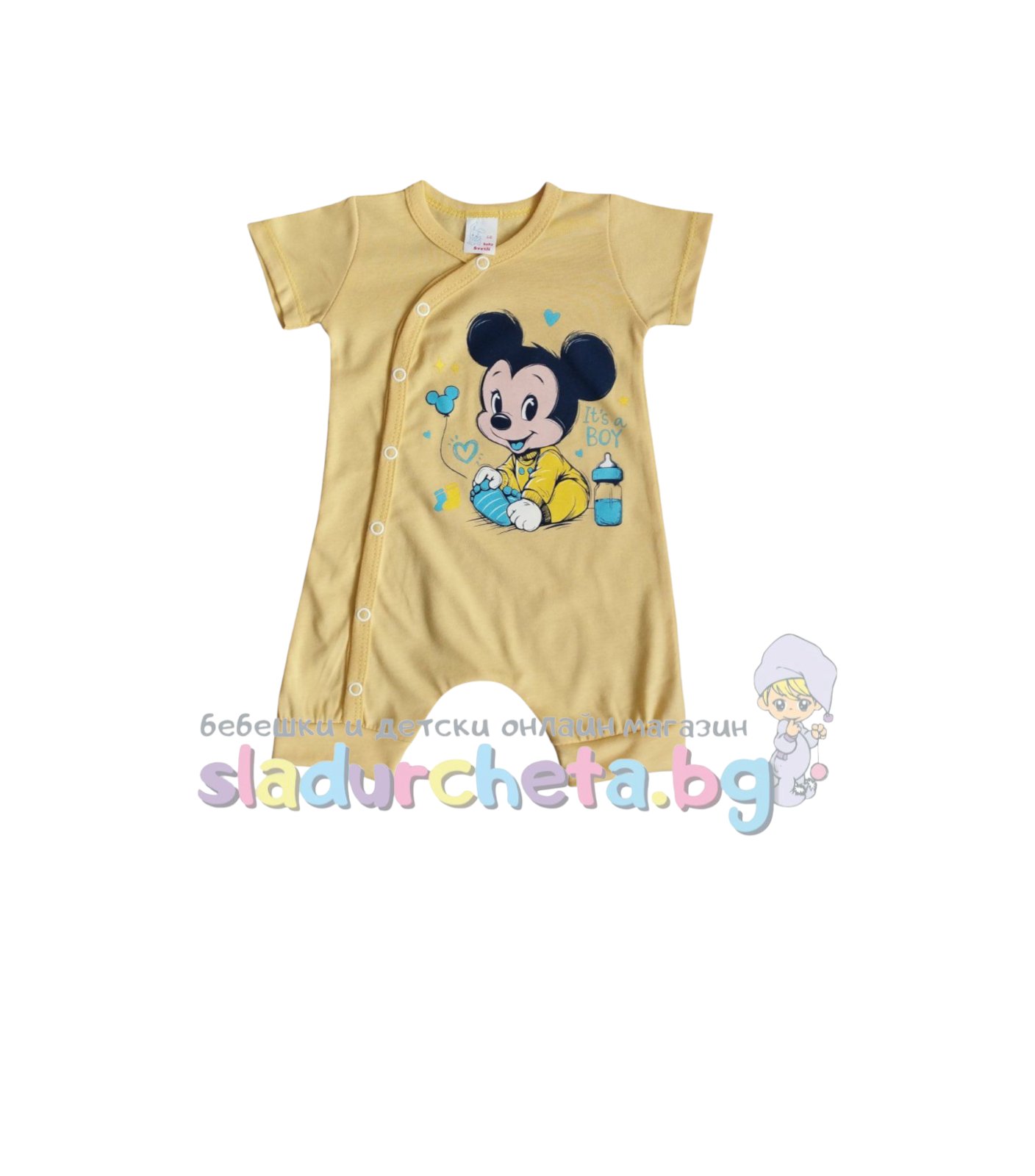 Гащеризонът е с къс ръкав в жълт цвят с цветна апликация на Мики Маус;