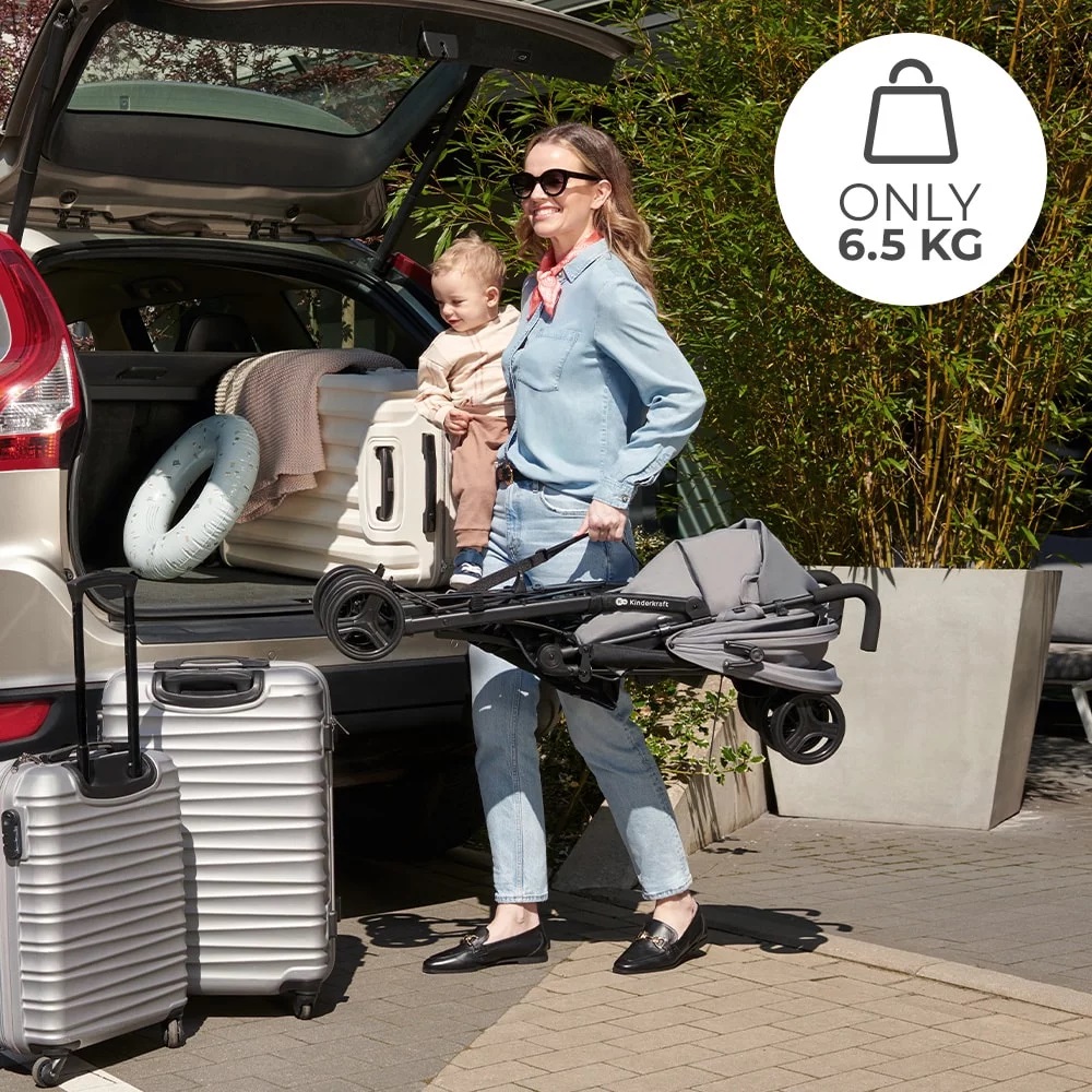 Сгъва се като чадър и е подходяща при пътуване със самолет или влак;