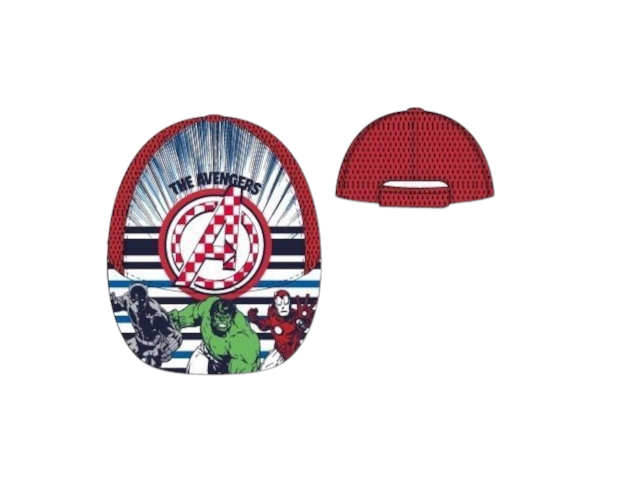 Шапката е в червен цвят с цветна апликация на Отмъстителите;