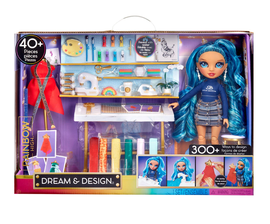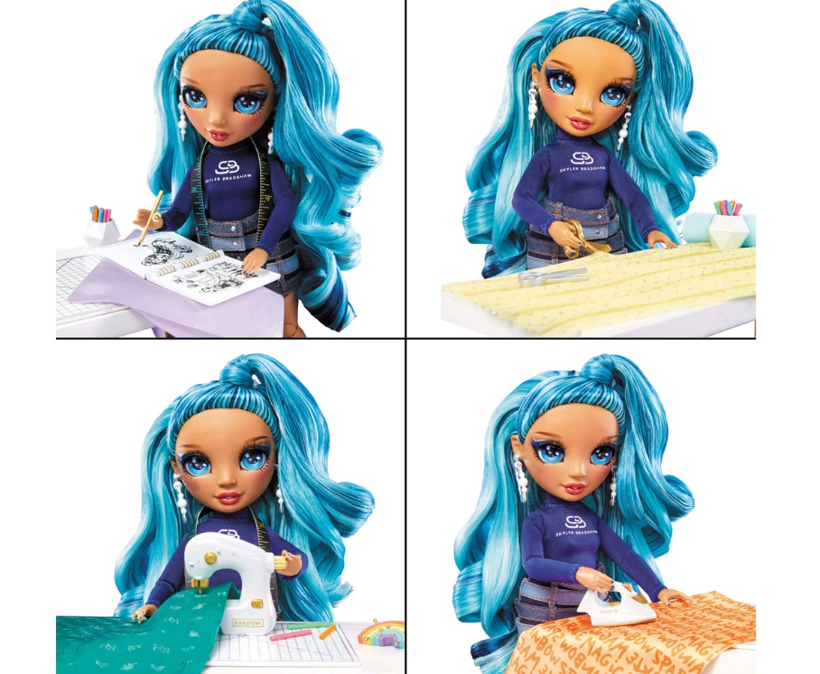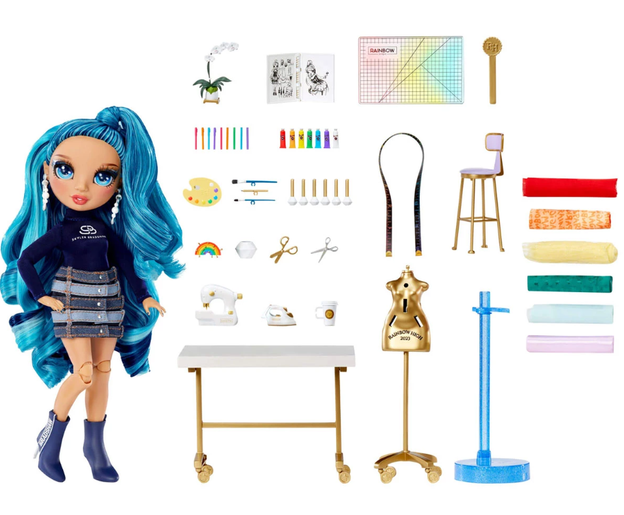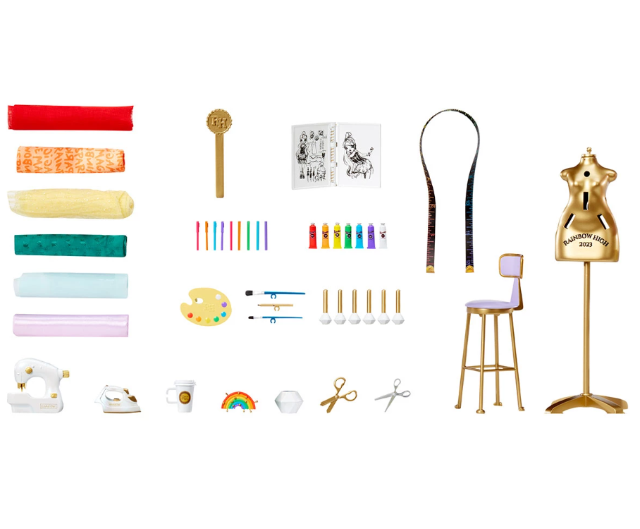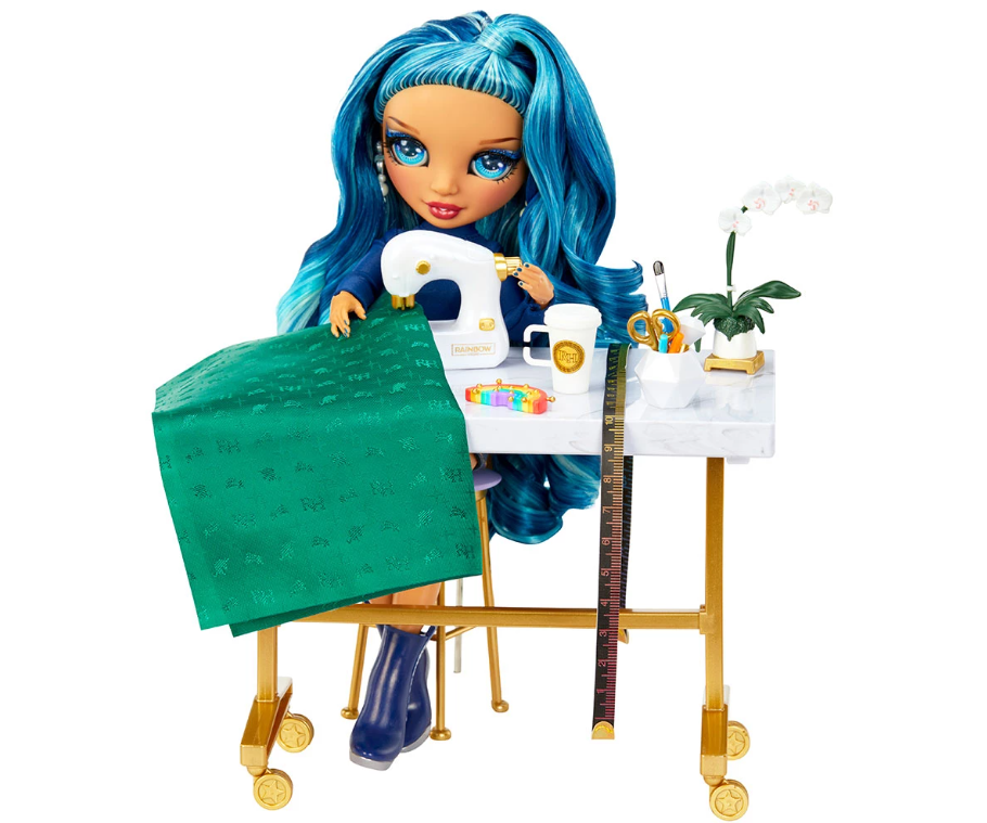 Комплектът включва: шевна машина, ютия, модна работна маса, книга със скици, функционален манекен, истински цветни тъкани Rainbow High и изключителна кукла Skyler Madison;
