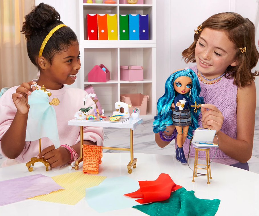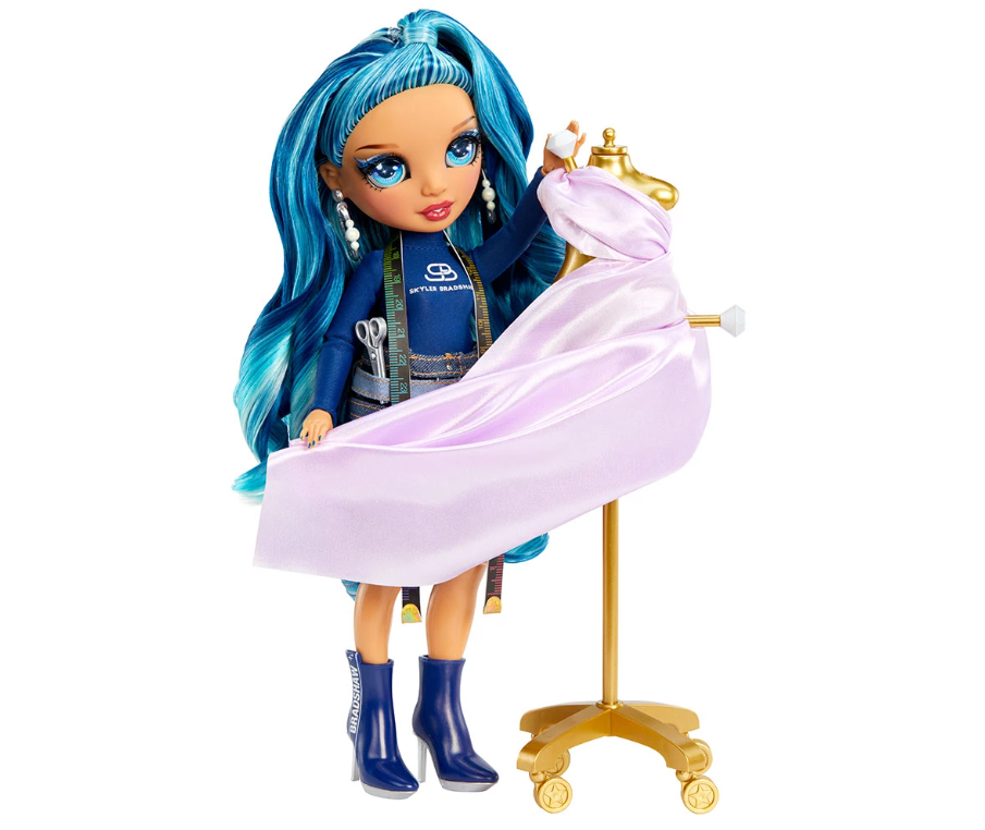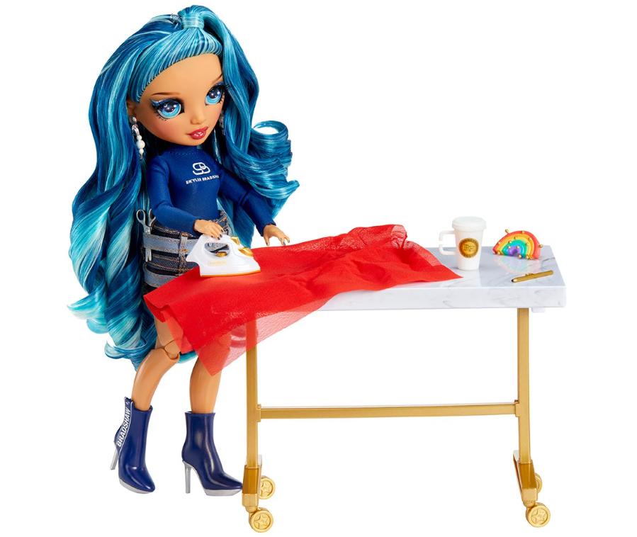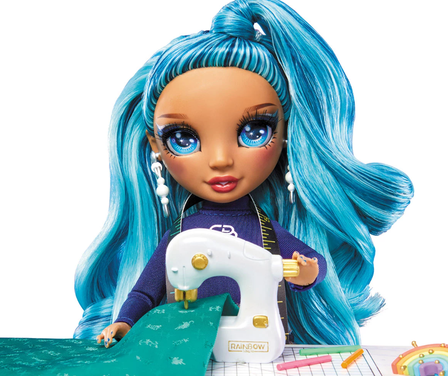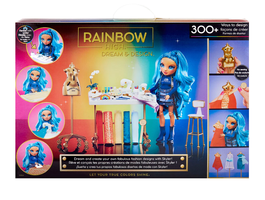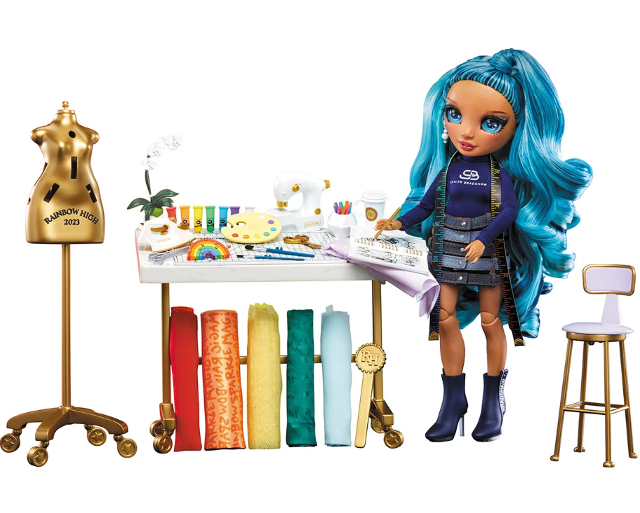Комплектът включва: шевна машина, ютия, модна работна маса, книга със скици, функционален манекен, истински цветни тъкани Rainbow High и изключителна кукла Skyler Madison;