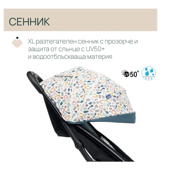 • Защитният сенник е с разтегателна част и е оборудван със сенник с UV50+ и водоотблъскващи обработки;