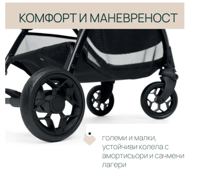 • Високопроизводителните колела, оборудвани със сачмени лагери и амортисьори, гарантират максимална маневреност върху всякакъв тип повърхност;