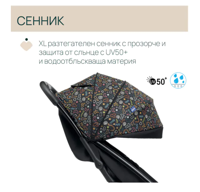• Защитният сенник е с разтегателна част и е оборудван със сенник с UV50+ и водоотблъскващи обработки;