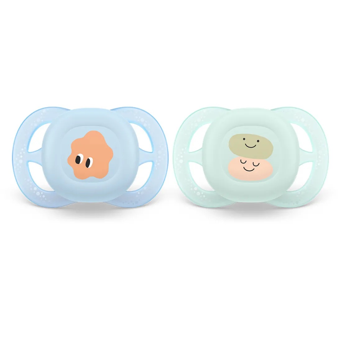 Комплект от 2 бр. ортодонтични залъгалки за новородени Philips AVENT Ultra Start 0-2м, в синьо и зелено със забавен декор, в кутия за стерилизиране