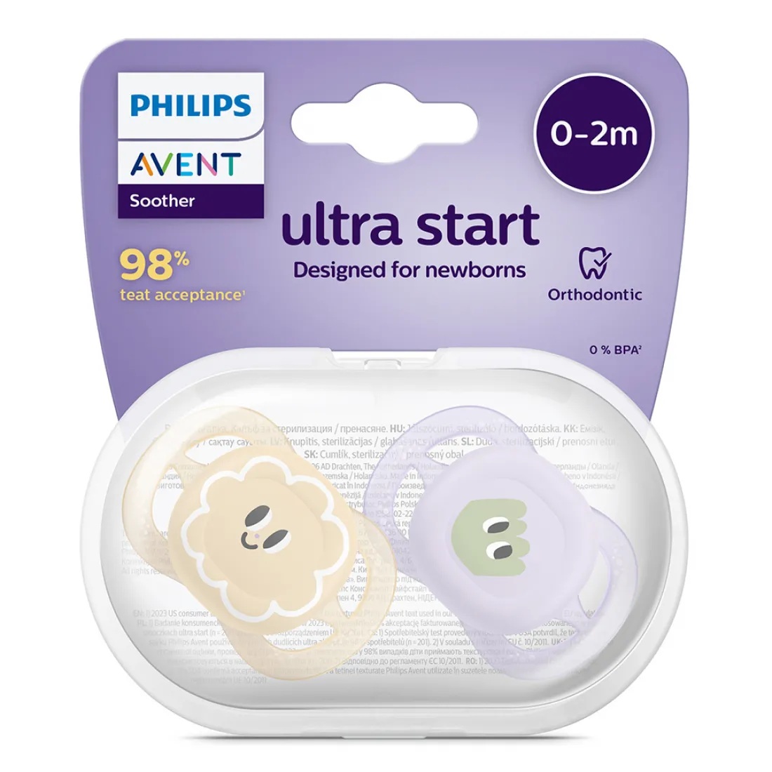 Комплект от 2 бр. ортодонтични залъгалки за новородени Philips AVENT Ultra Start 0-2м, в оранжево и лилаво със забавен дизайн очички, в кутия за стерилизиране