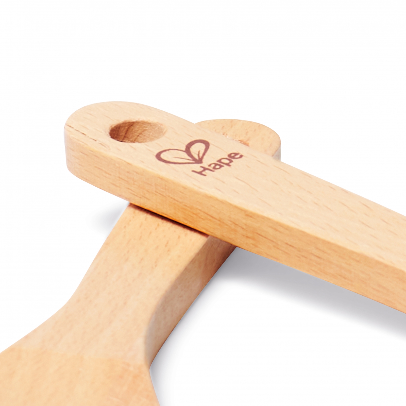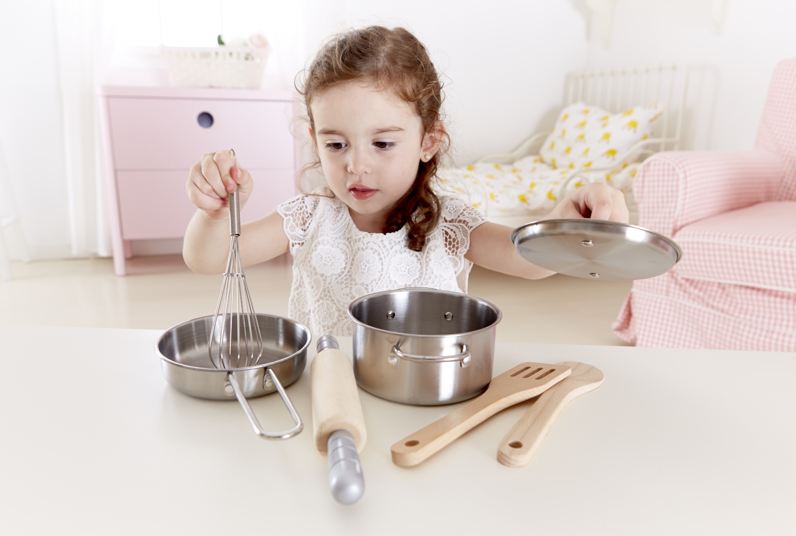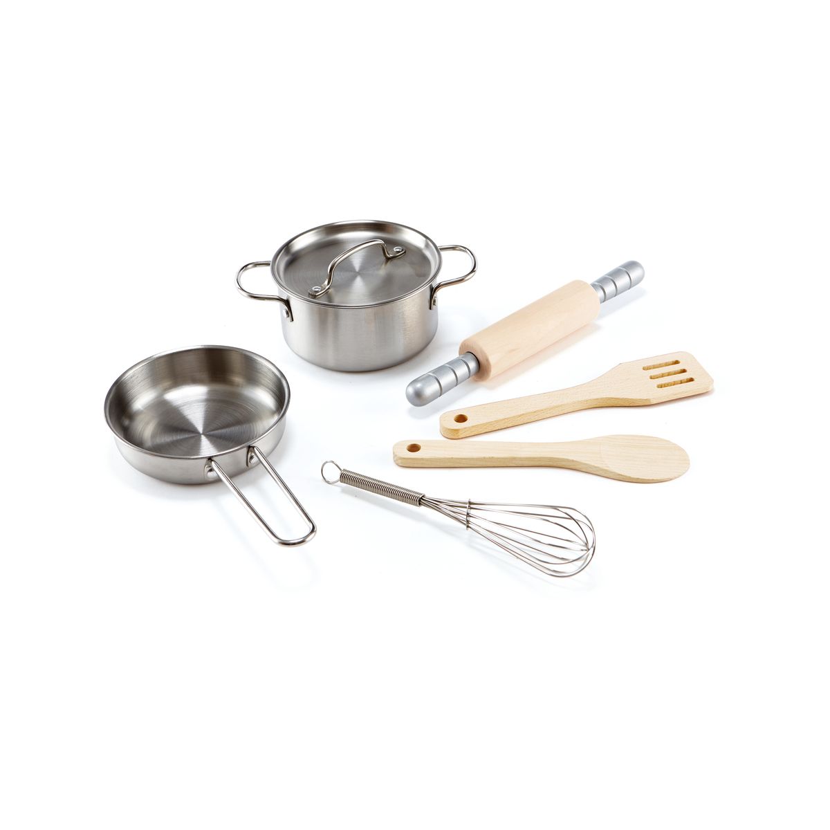 Комплектът включва: Метална тенджерка с капак, метален тиган и бъркалка, дървена точилка, дървена лъжица за готвене и решетъчна лъжица - основни прибори за всеки млад готвач;