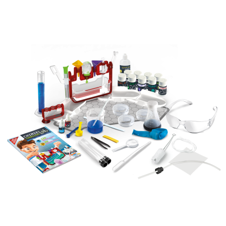 Комплектът включва изключително широка гама от лабораторни инструменти и безопасни, сертифицирани химически вещества, които децата могат да използват за извършване на различни химически реакции;