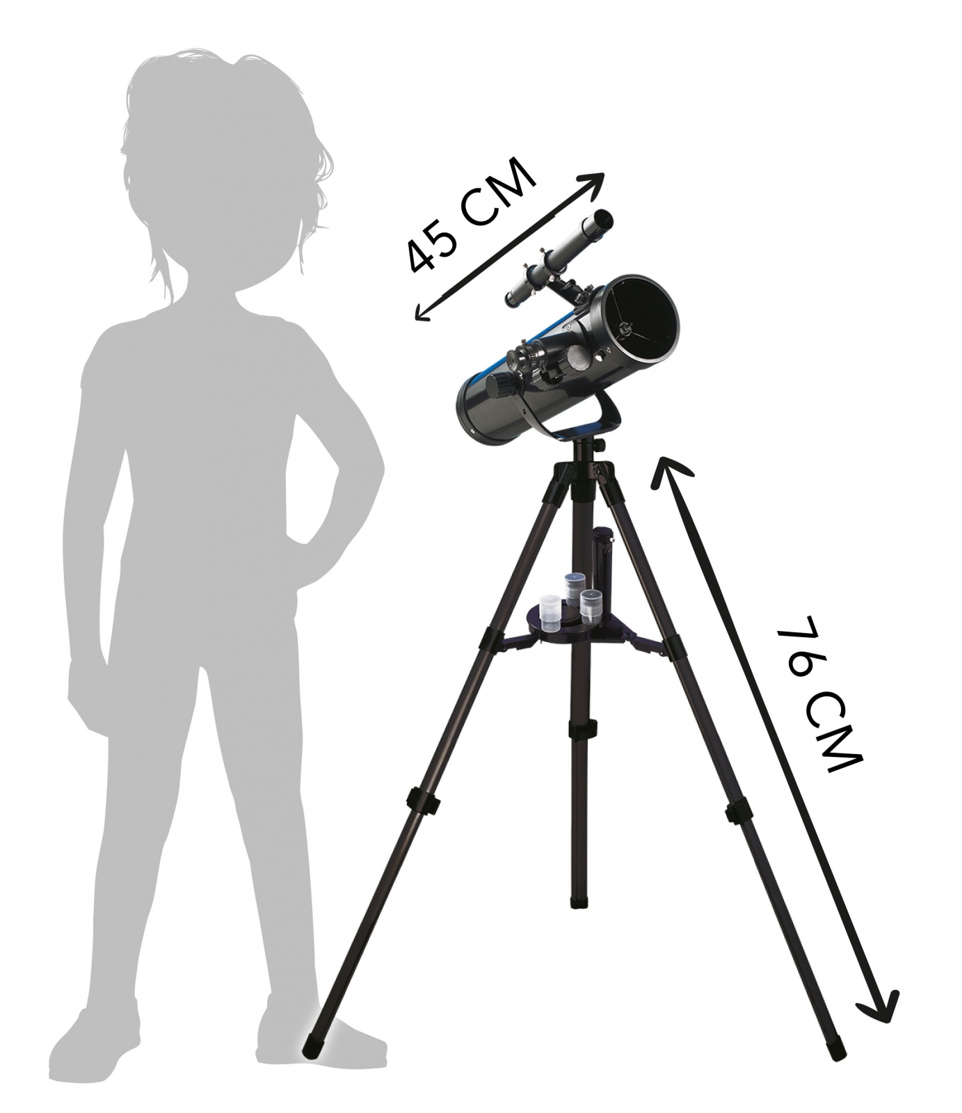 • Включени: 1 тръба, 1 статив, 1 монтаж, 1 дълги винтове, шайби и крилчати гайки (x3), 1 къси винтове, шайби и крилчати гайки (x3), 1 монтаж, 2 винта, 1 тава, окуляри (20 mm/12,5) mm/4 mm), 1 леща на Барлоу, 1 търсачка, 1 опора за търсачка, 1 карта на небето, компас, изрязани карти, 1 илюстрована брошура с 50 дейности;