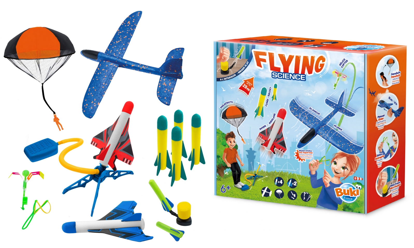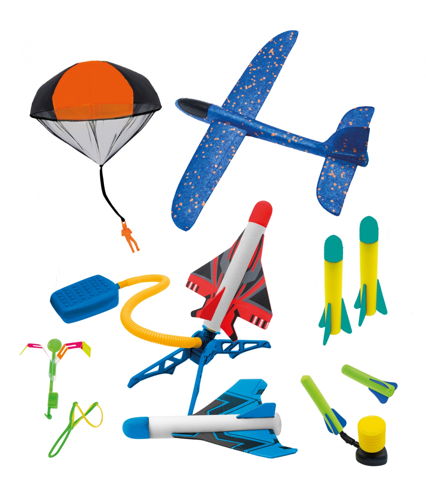 Най-забавното е включено в комплекта, помпа която изстрелва ракети и самолети над 25 метра във въздуха;