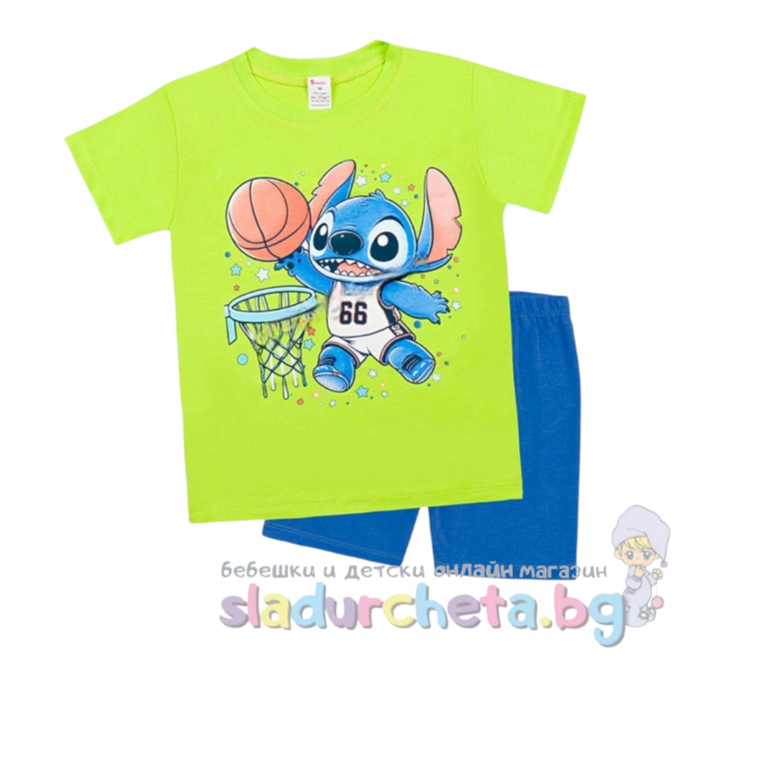 Тениската е с къс ръкав в неоново зелен цвят с апликация на Стич;