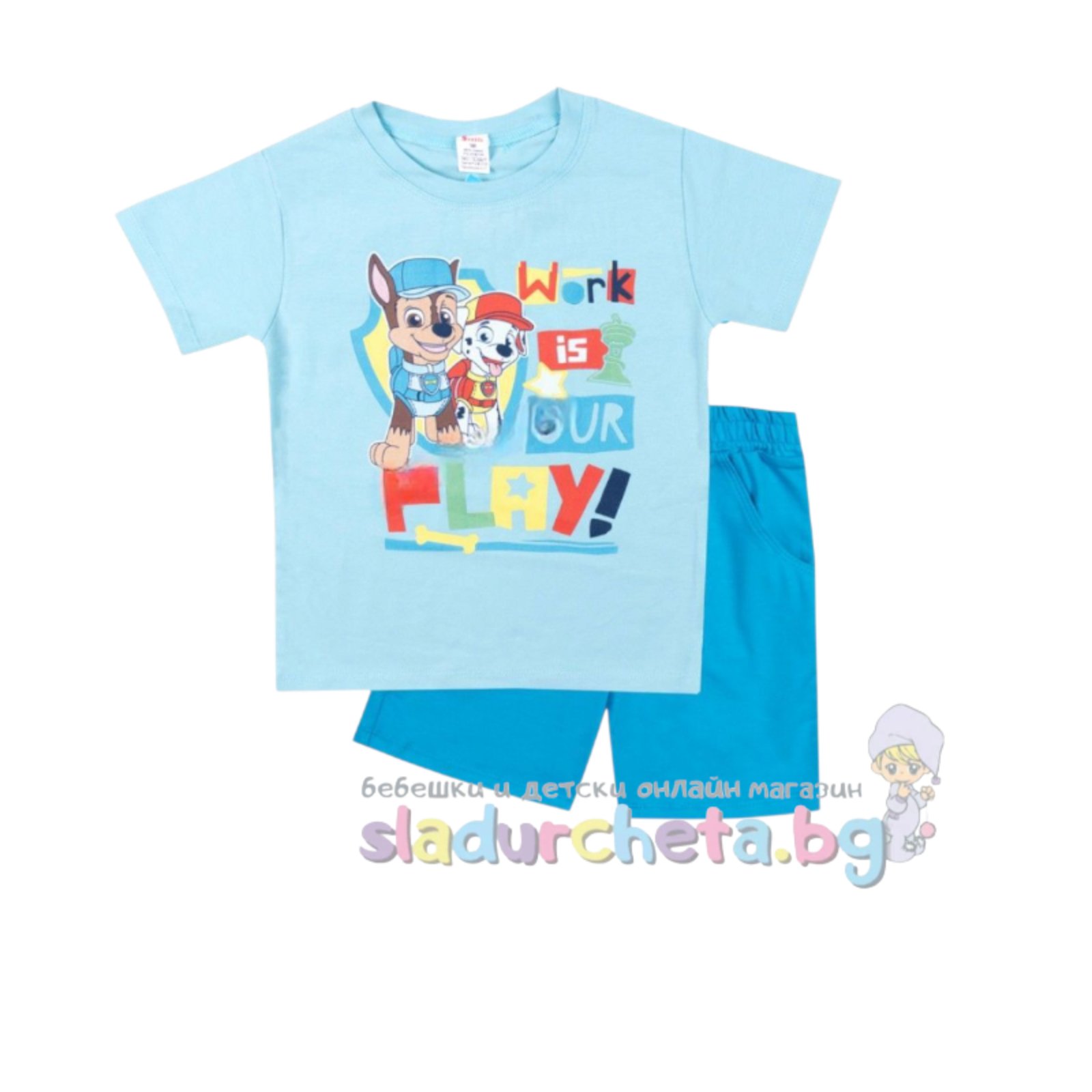 Тениската е с къс ръкав в син цвят с апликация на Пес Патрул;