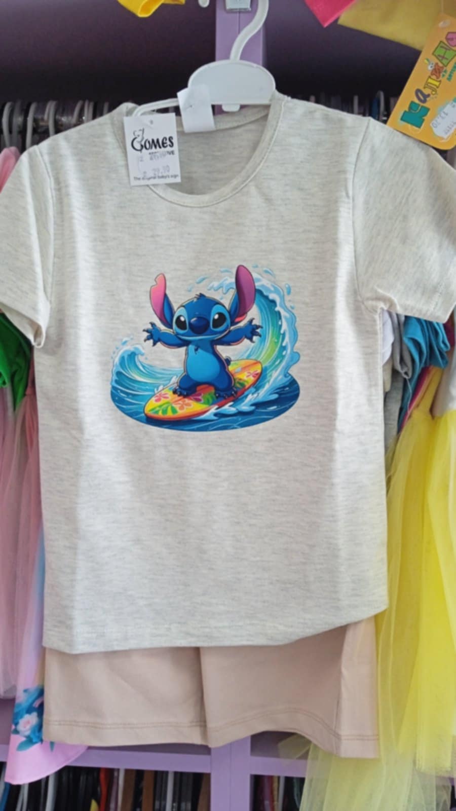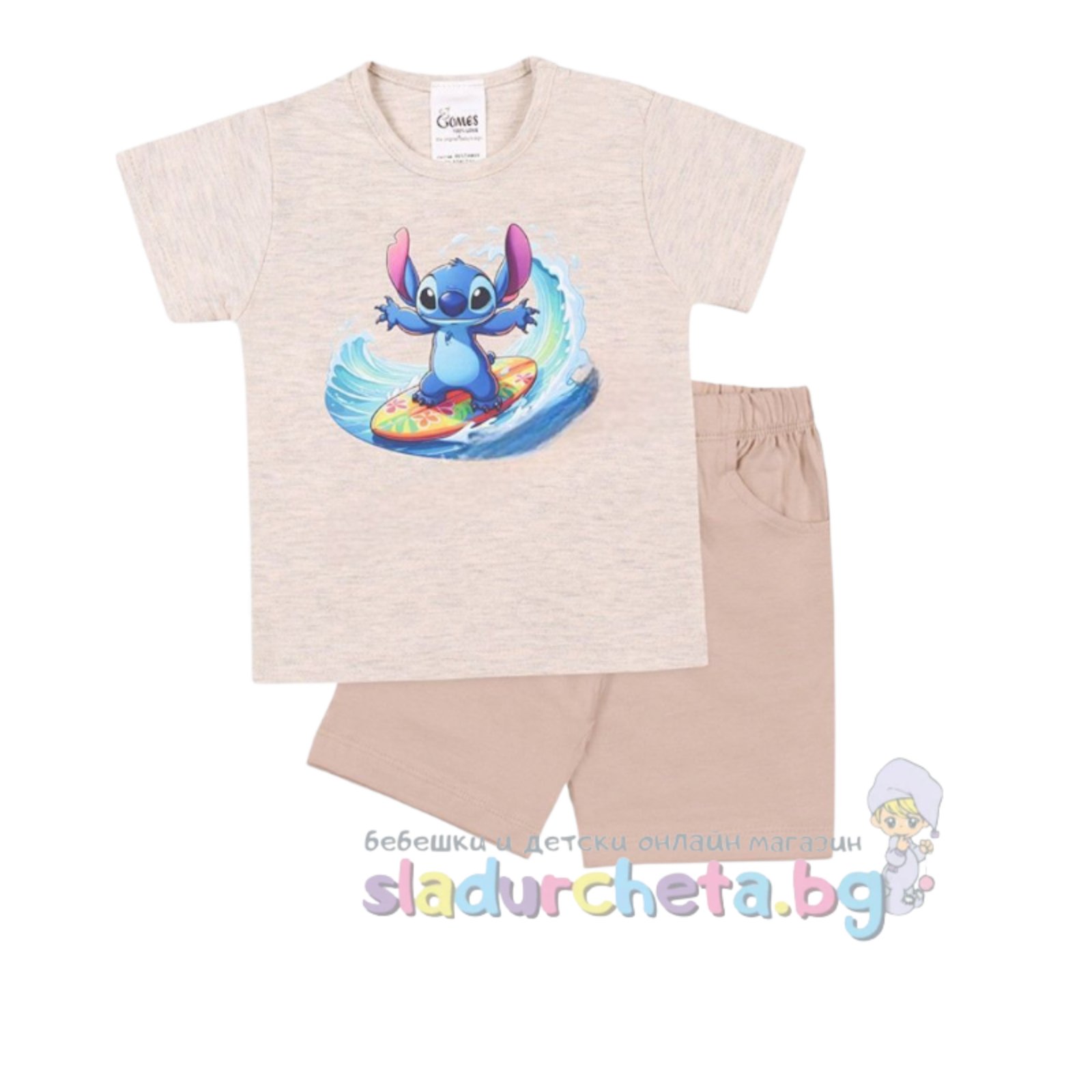 Тениската с къс ръкав в бежов цвят с цветна апликация на Стич;