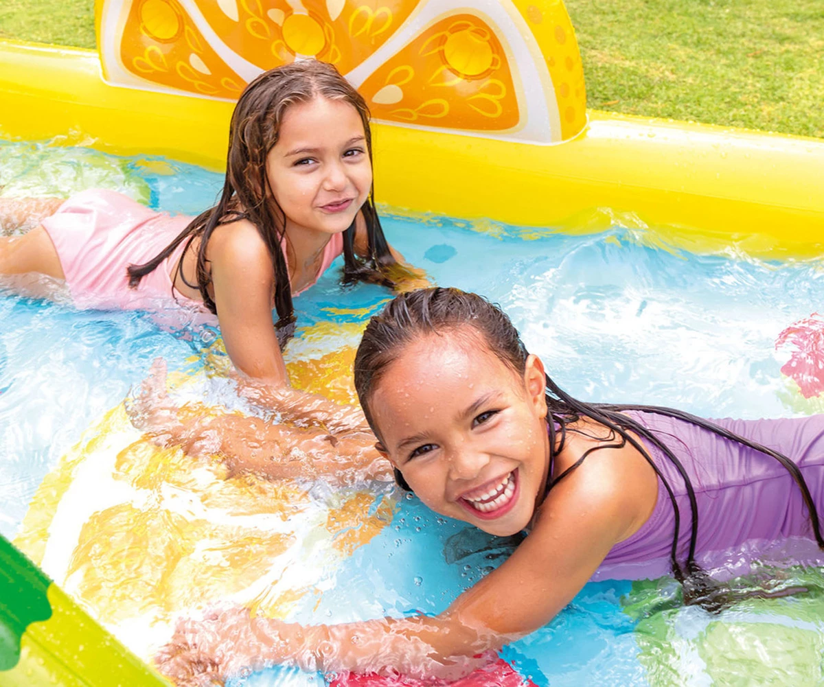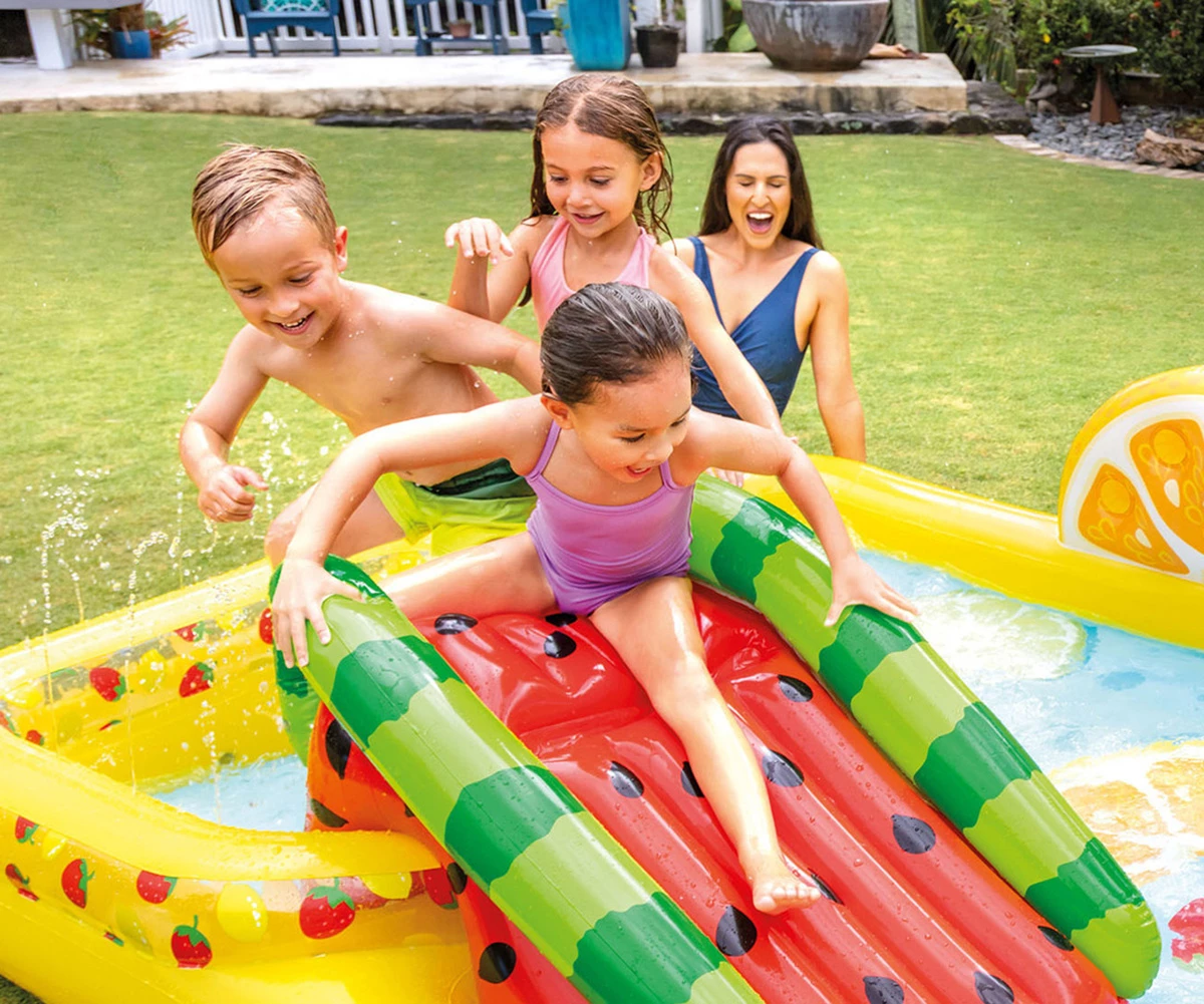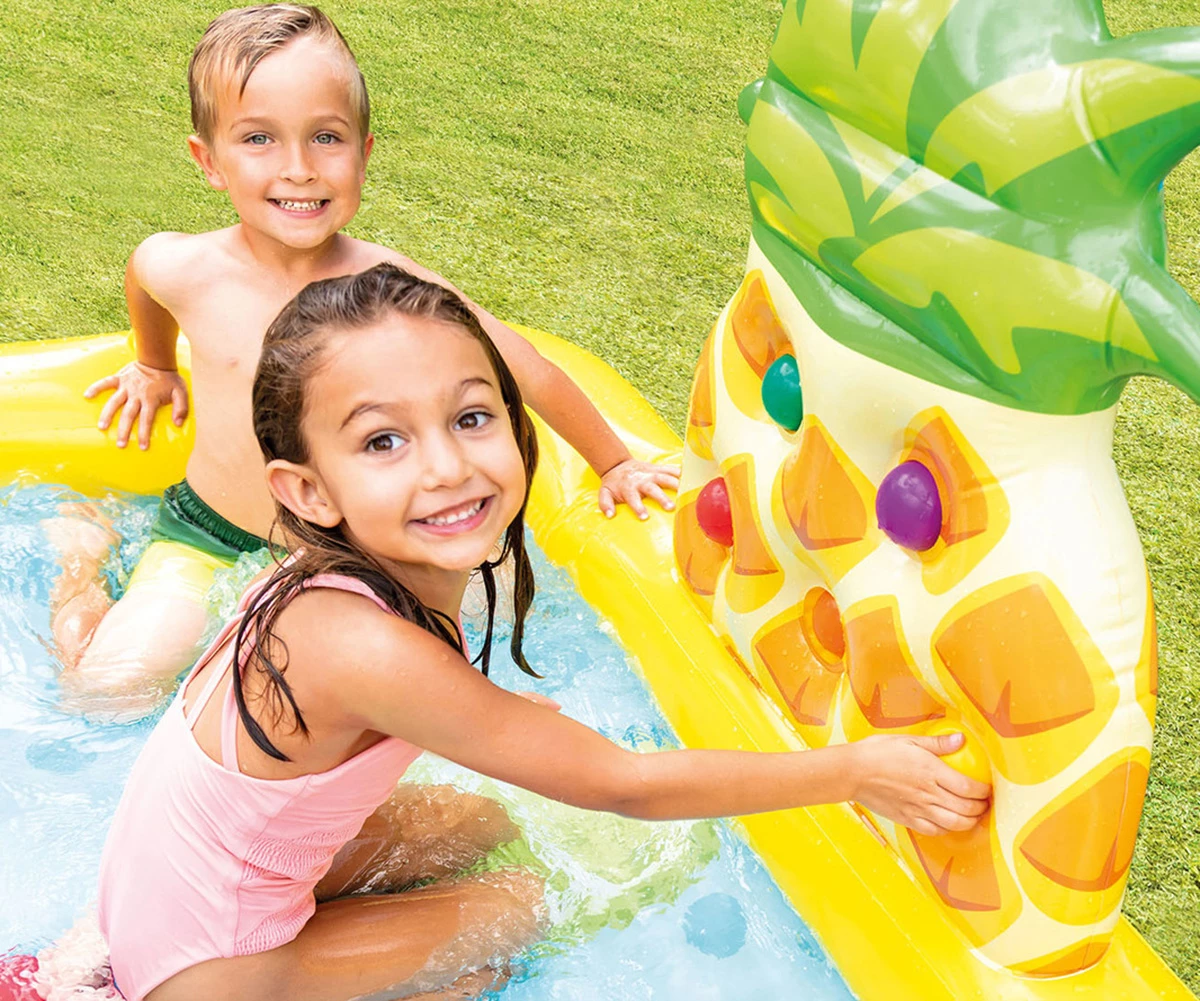 • Направете горещото лятото по-весело и прохладно с надуваемия център за игра INTEX Fun 'N Fruity Play Center;