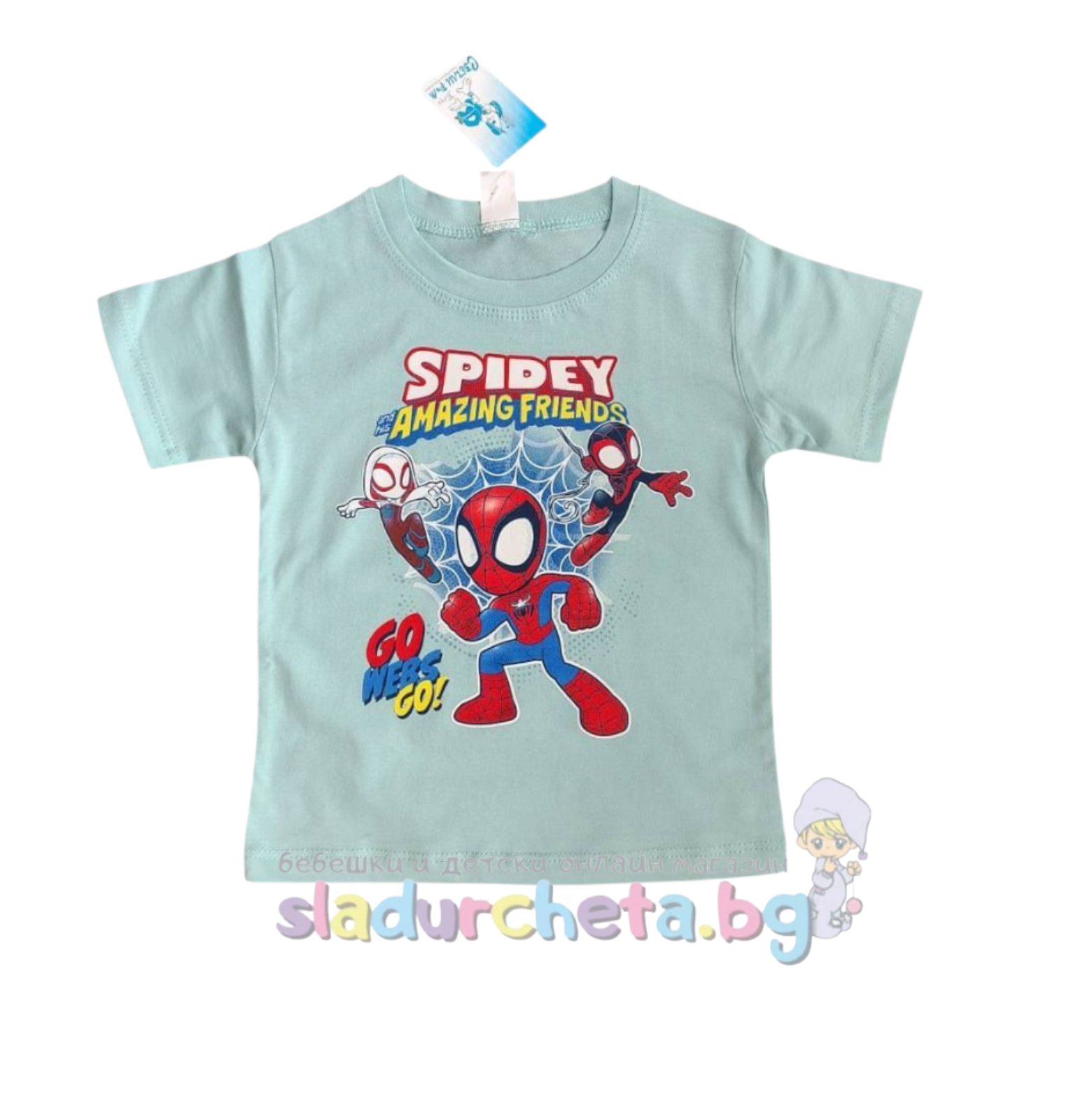 Тениската е с къс ръкав в цвят олив с цветна апликация на Спайдърмен;