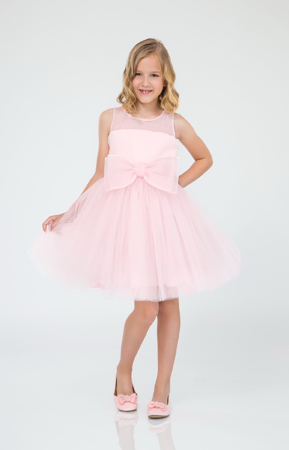 Официална рокля с прозрачни презрамки в светлорозов цвят с голяма тюлена панделка отпред;