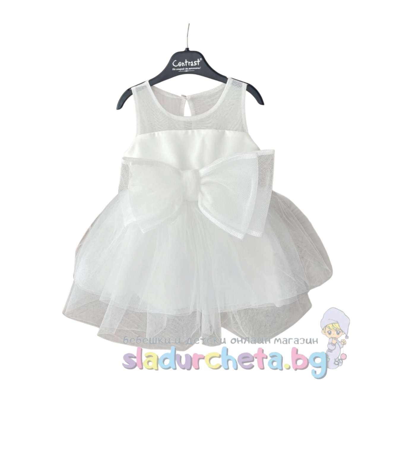 Официална рокля с прозрачни презрамки в бял цвят с голяма тюлена панделка отпред;