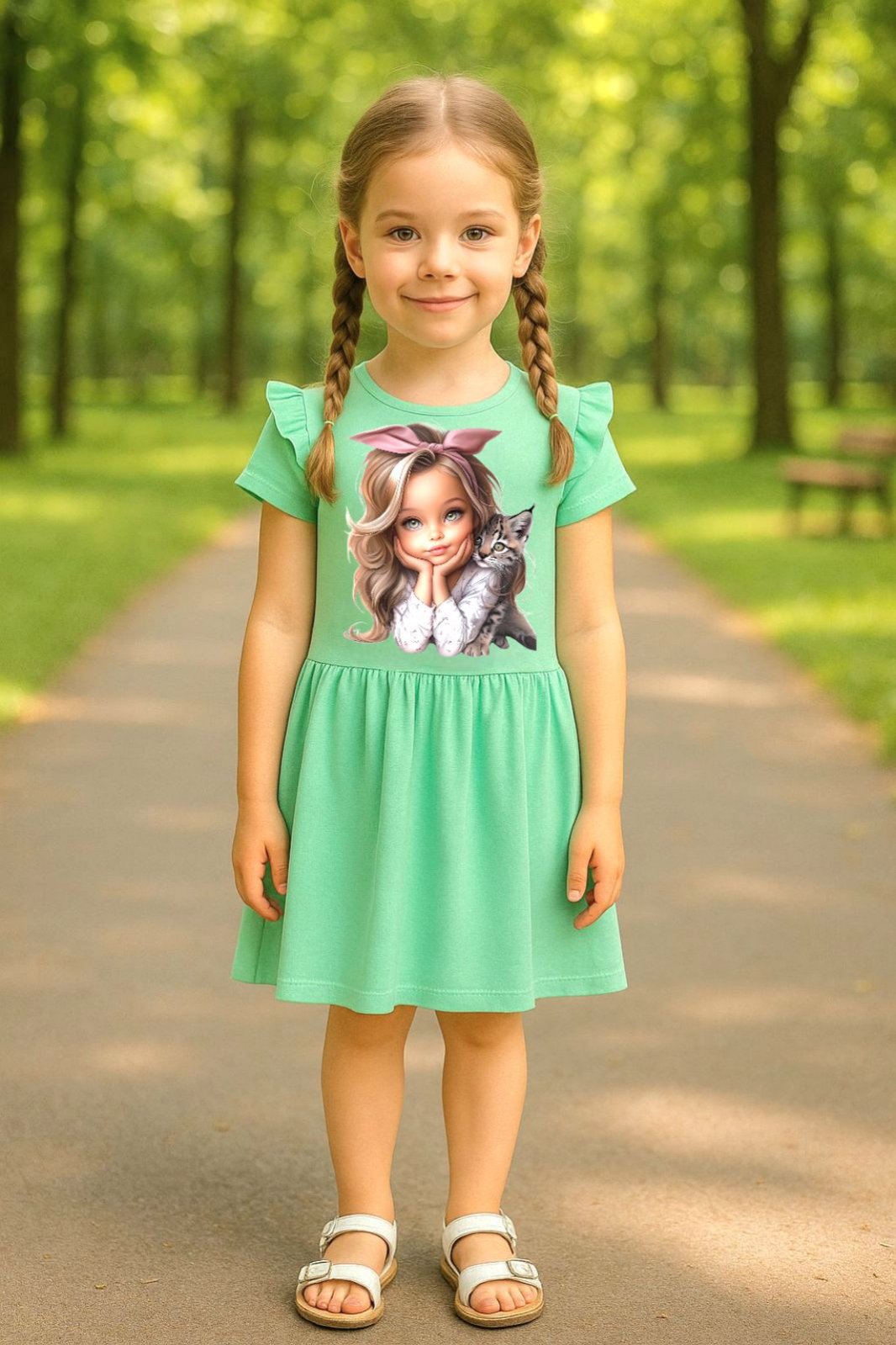 Роклята е с къс ръкав в зелен цвят с апликация на момиче;