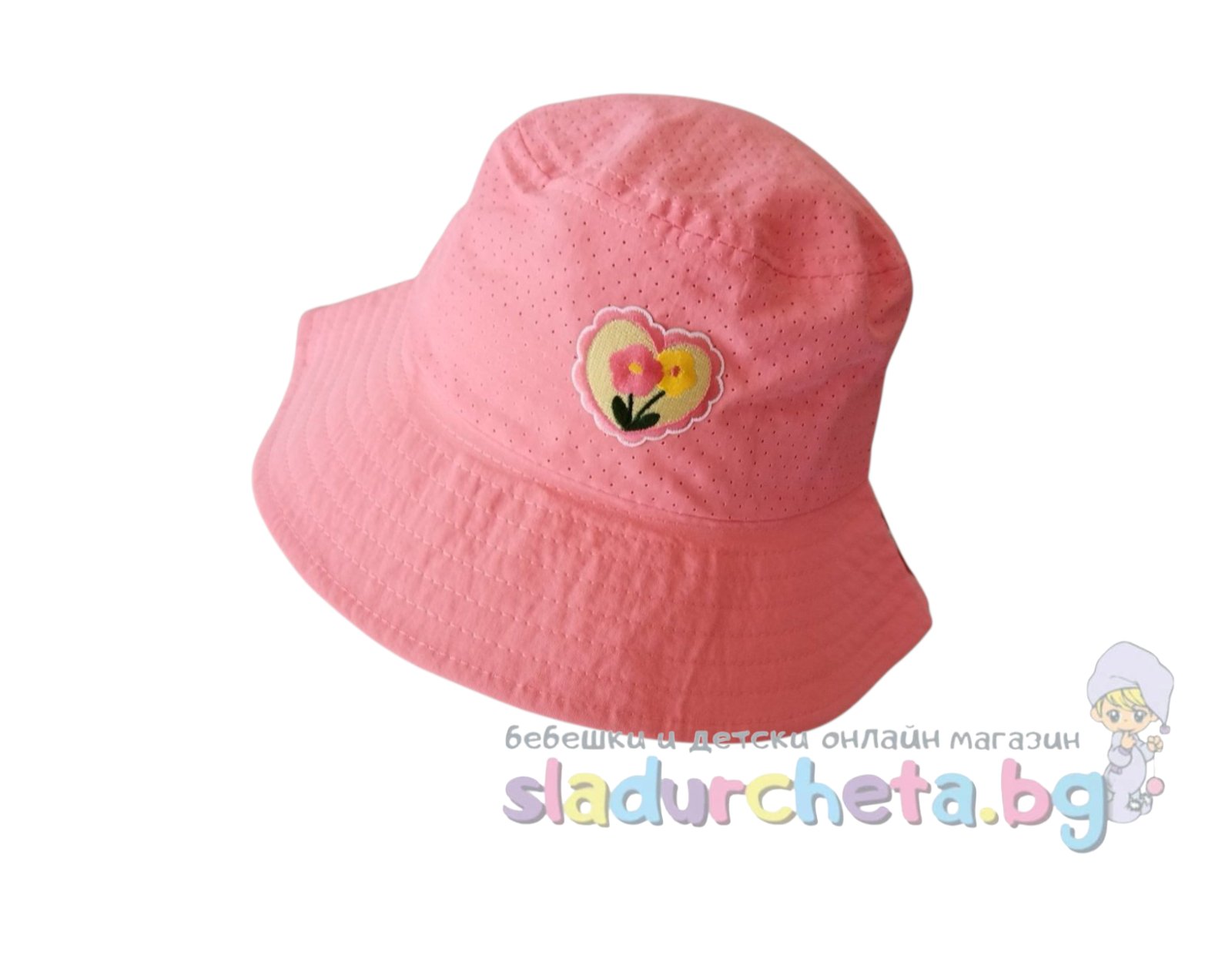 Шапката е в цвят праскова с пришита апликация на цвете в сърце;