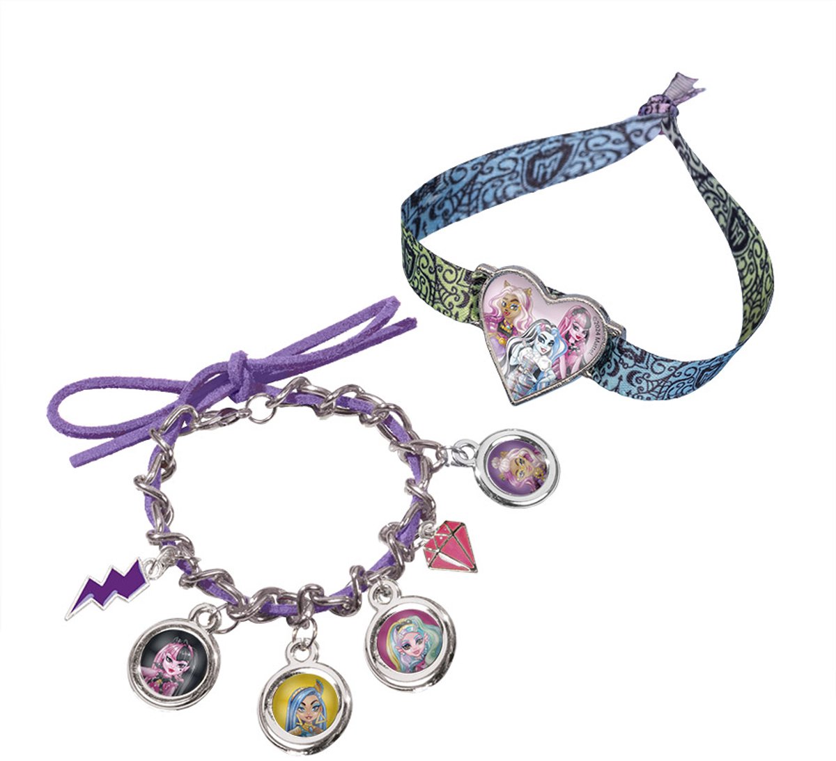 Комплекта включва една гривна от луксозна сатененна панделка с талисман с формата на сърце и 2D стикер и сребриста гривна с велурена връв, която може да украсите с талисмани във формата на светкавица и диамант и 2D стикери;