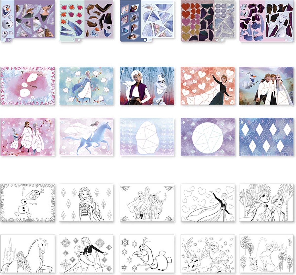 Книжката включва: 10 пъзела със стикери, 5 листа със стикери, 2 холографски и 10 страници за оцветяване на любимите ви герои от Frozen;