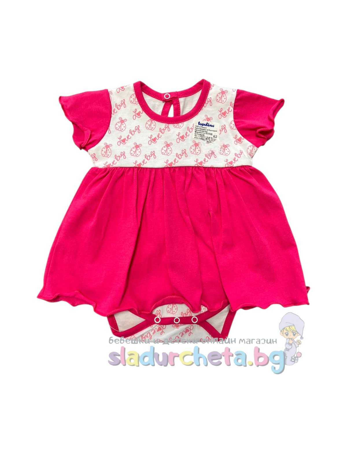 Горната част съчетава визията на красива рокличка с функционалността на меко памучно боди, което се закопчава удобно между крачетата;