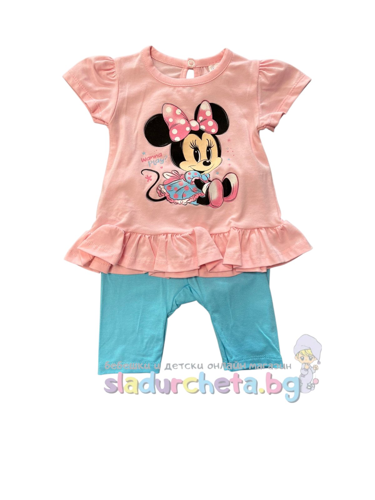 Туниката е с къс ръкав в цвят праскова с апликация на Мини Маус и къдрави акценти в долната част;