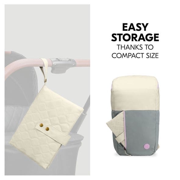 Малката чанта за пелени се предлага с практична подложка за повиване, която Ви позволява да сменяте пелените на Вашето бебе по хигиеничен и удобен начин по време на разходки, излети или пикници;