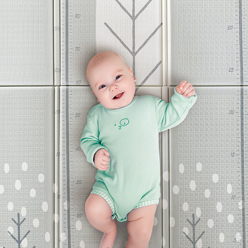 Постелката разполага с буквите от азбуката от едната страна и от другата страна, скала за измерване, за да можете да проверявате височината на Вашите бебета, докато растат;